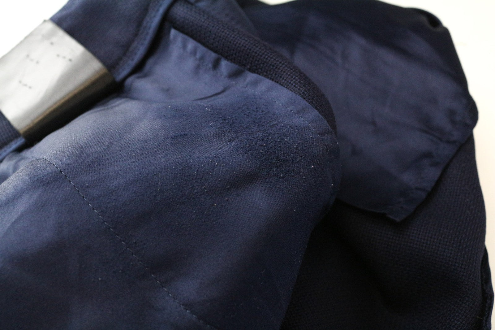Būklė: Sutaisyta juosmens linija, ištraukti siūlai ant dešinės kojos priekyje ir kairės kojos gale. Dėmė ant kairės kojos. Žiūrėkite pridėtas nuotraukas.