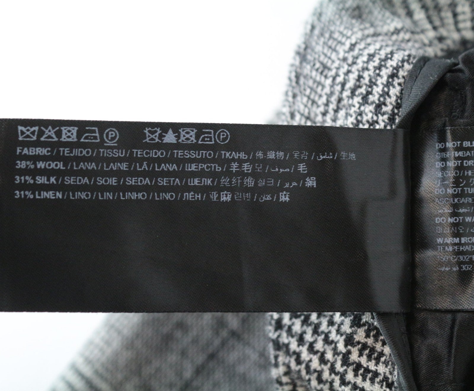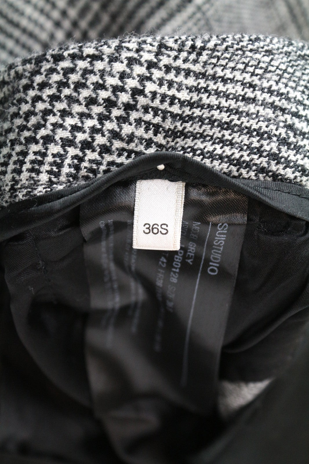 SUISTUDIO moteriškos kelnės su pilkais languotais raštais (UK10S) su plonomis vilnos, šilko ir lino mišinio raštu.