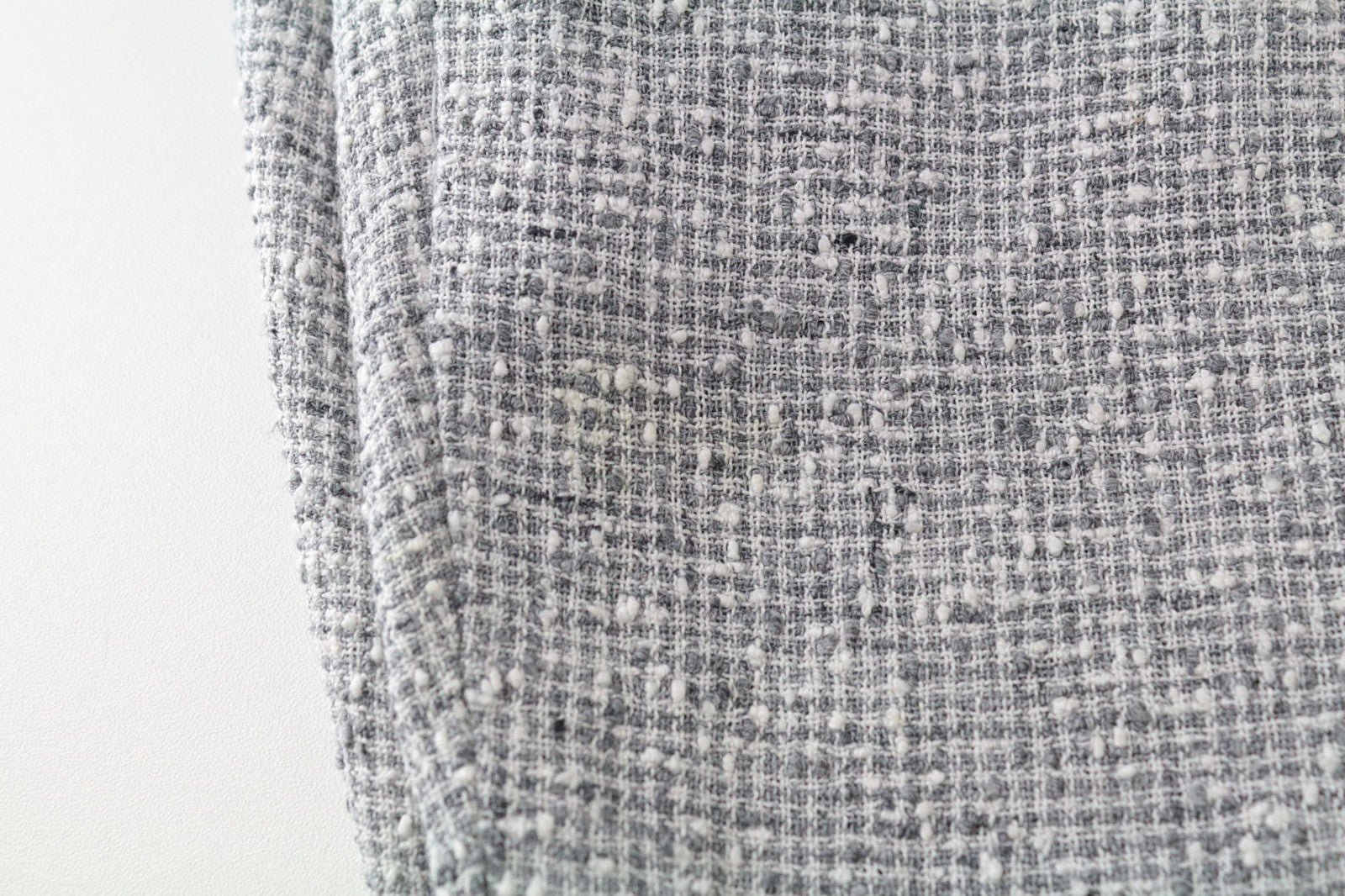 SUISTUDIO moteriškos kelnės su pilkomis, plonomis, UK14S rašto, klasikinio kirpimo lininiu raštu.