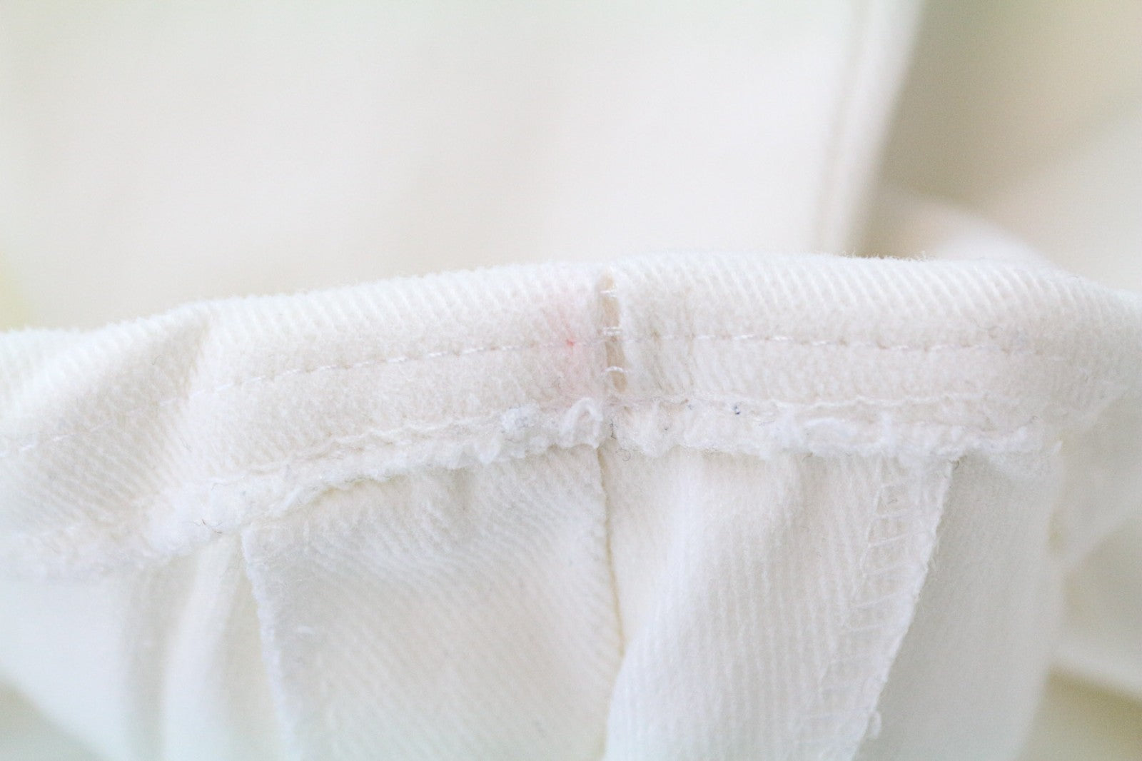 Būklė: Sulopyti apsiuvai. Dėmės vidinėje pusėje, priekyje ir gale. Praplonintas audinys ties tarpkoju. Žr. pridėtas nuotraukas.