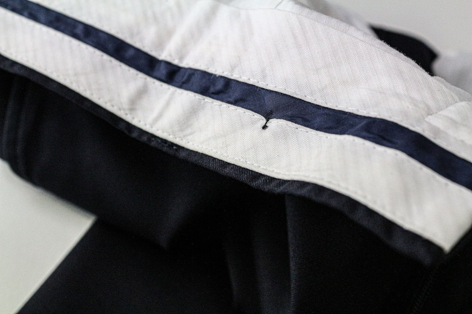 Stained trousers lining, pulled threads at the back. Pulled threads on the waistcoat's belt and a stain on the back. Please see added photos.