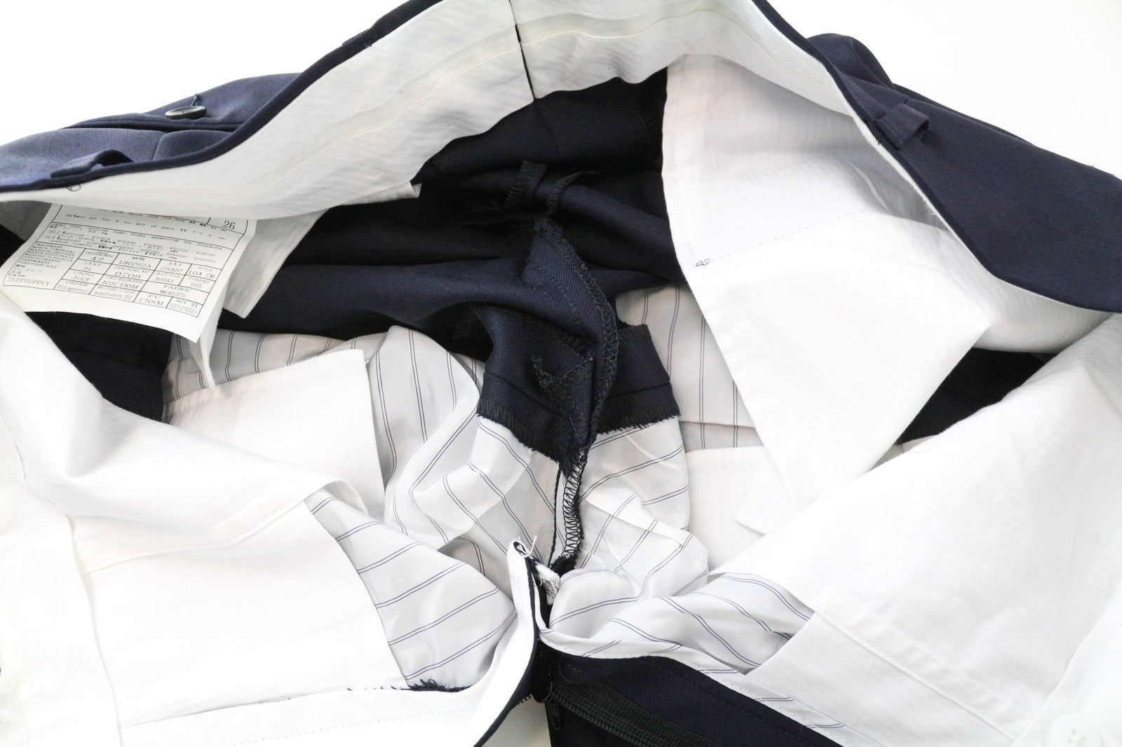 Used. Mended inner trousers' lining around the crotch area. Stained inside, pulled thread on the upper front. Pulled threads on the right leg. Please see added photos.