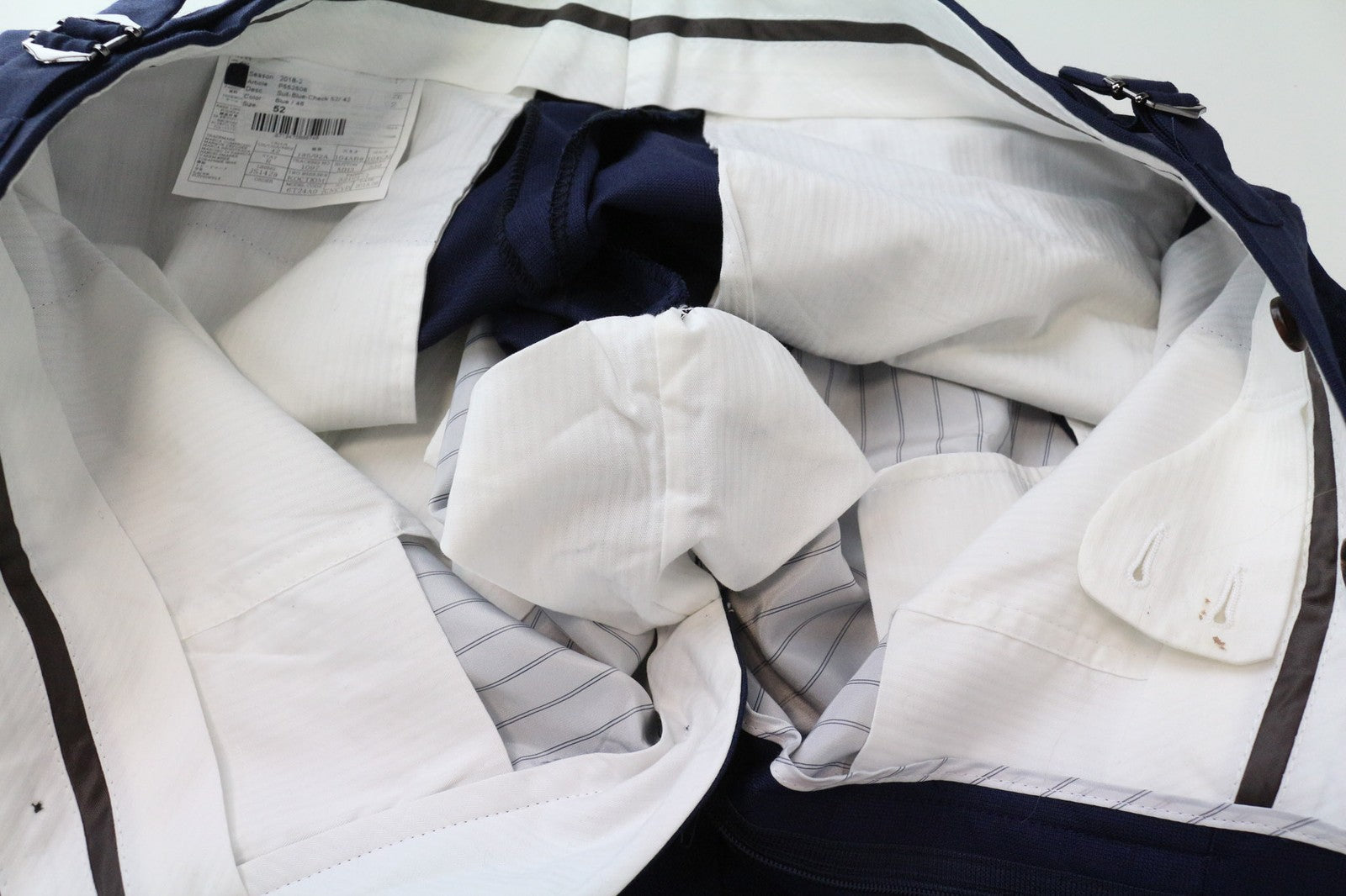 Būklė: Used. Alterations have been made to the trousers: length, waistline width, and around the crotch area. Stained waistline area. Please see added photos.