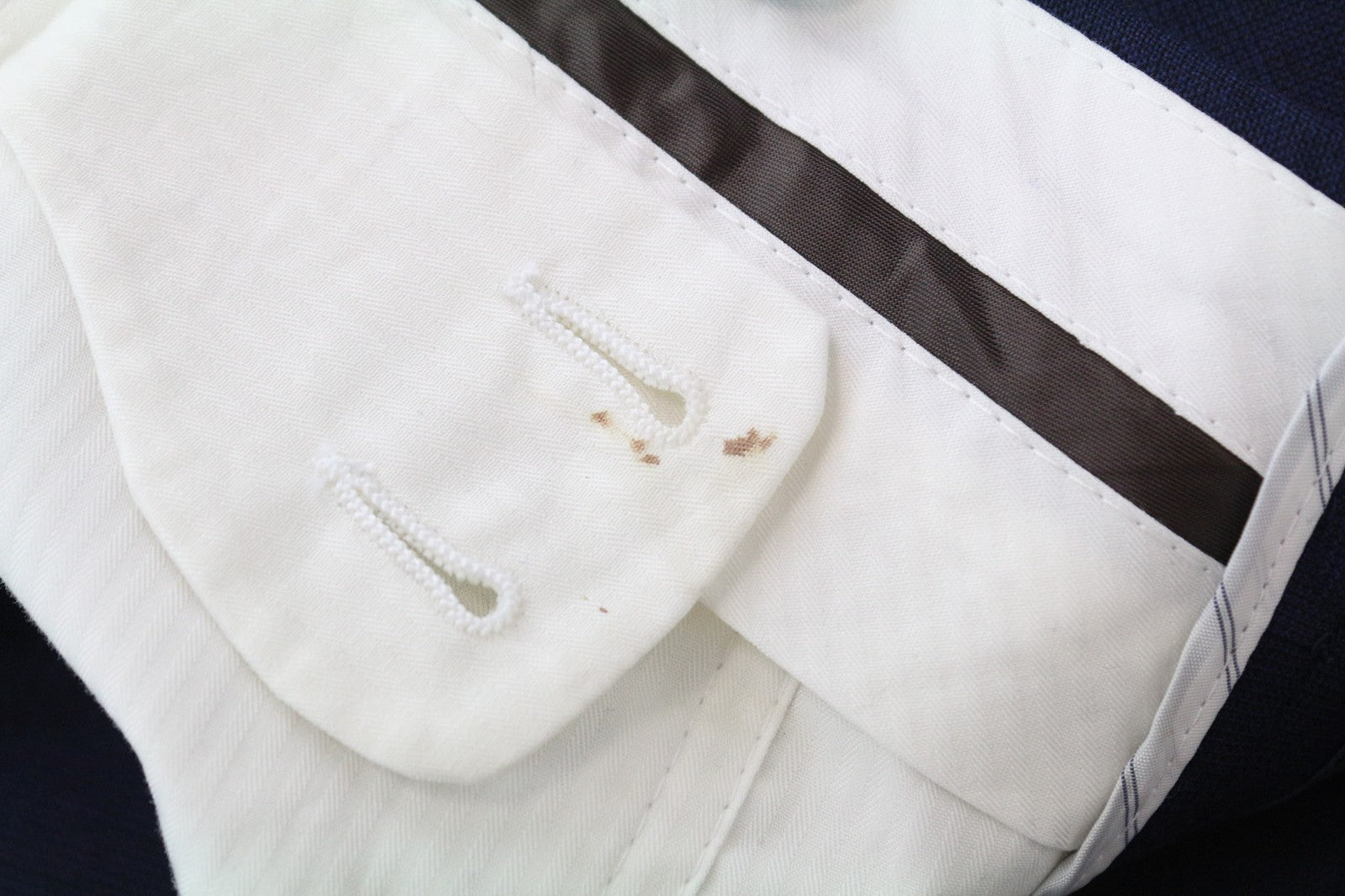 Used. Alterations have been made to the trousers: length, waistline width, and around the crotch area. Stained waistline area. Please see added photos.