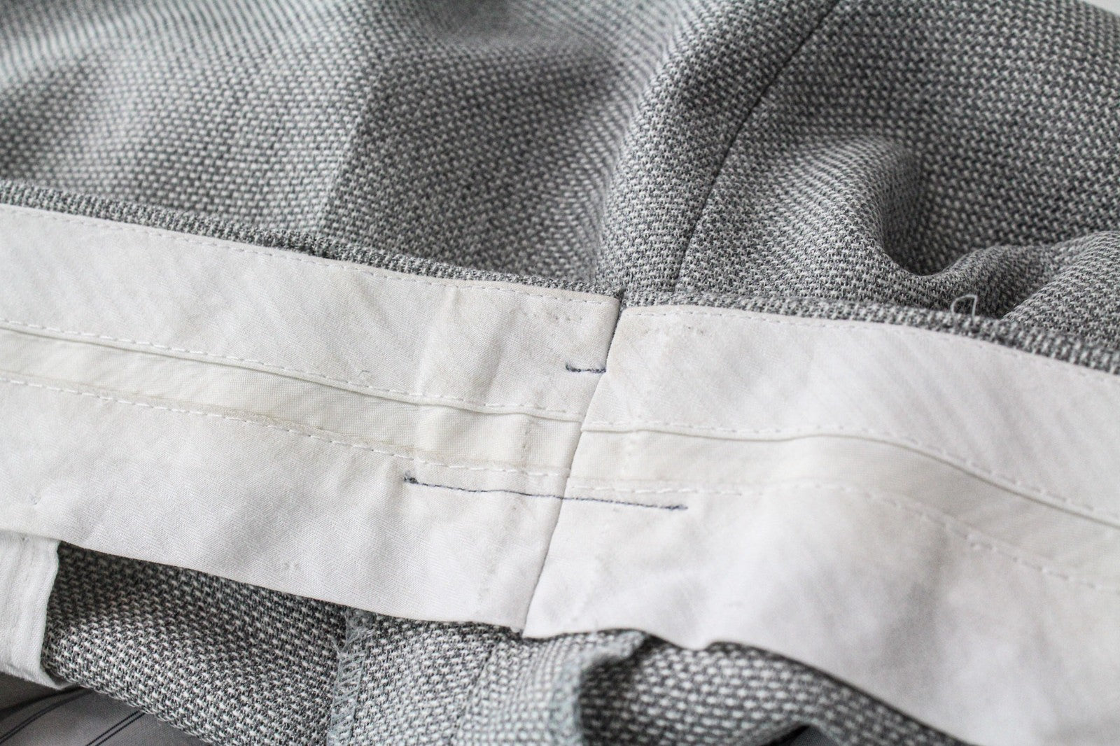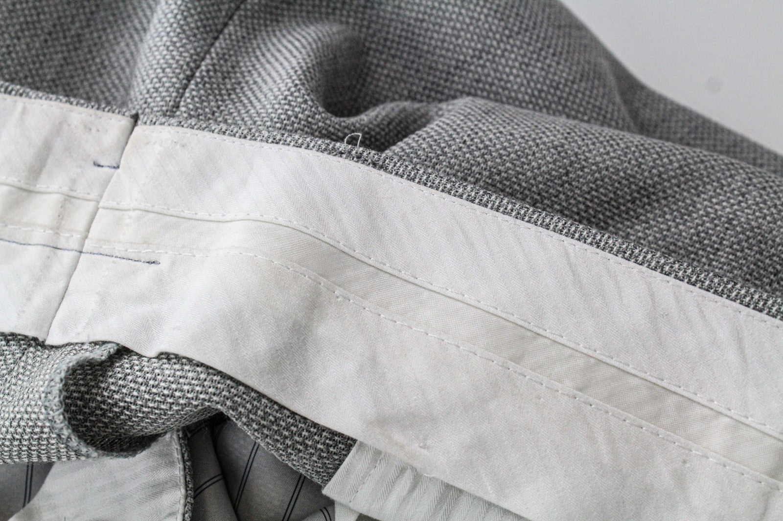 Used. Stained neckline, trousers' waistline. Tailored trousers' length, waistline width, and around the crotch area. Please see added photos.