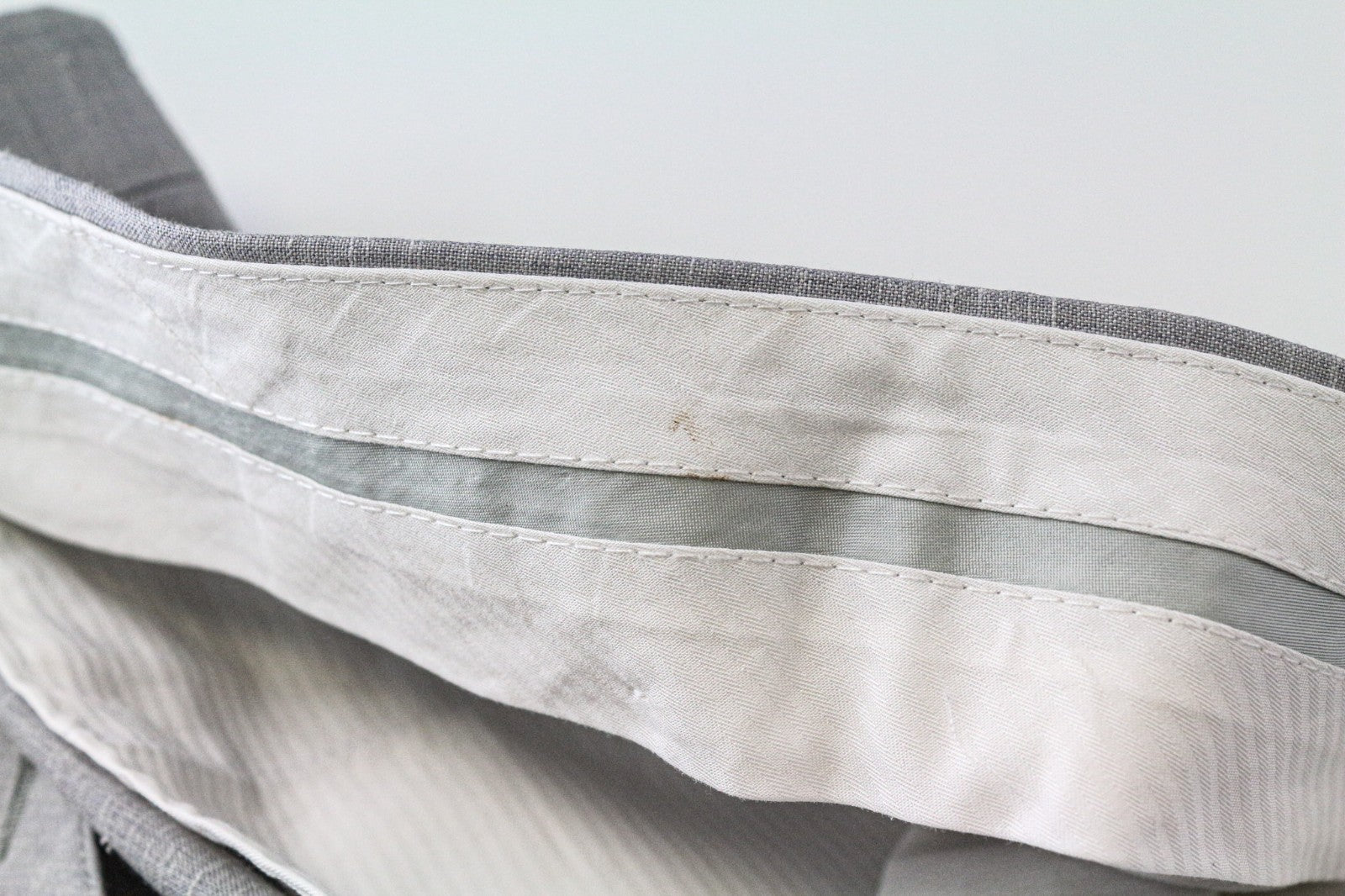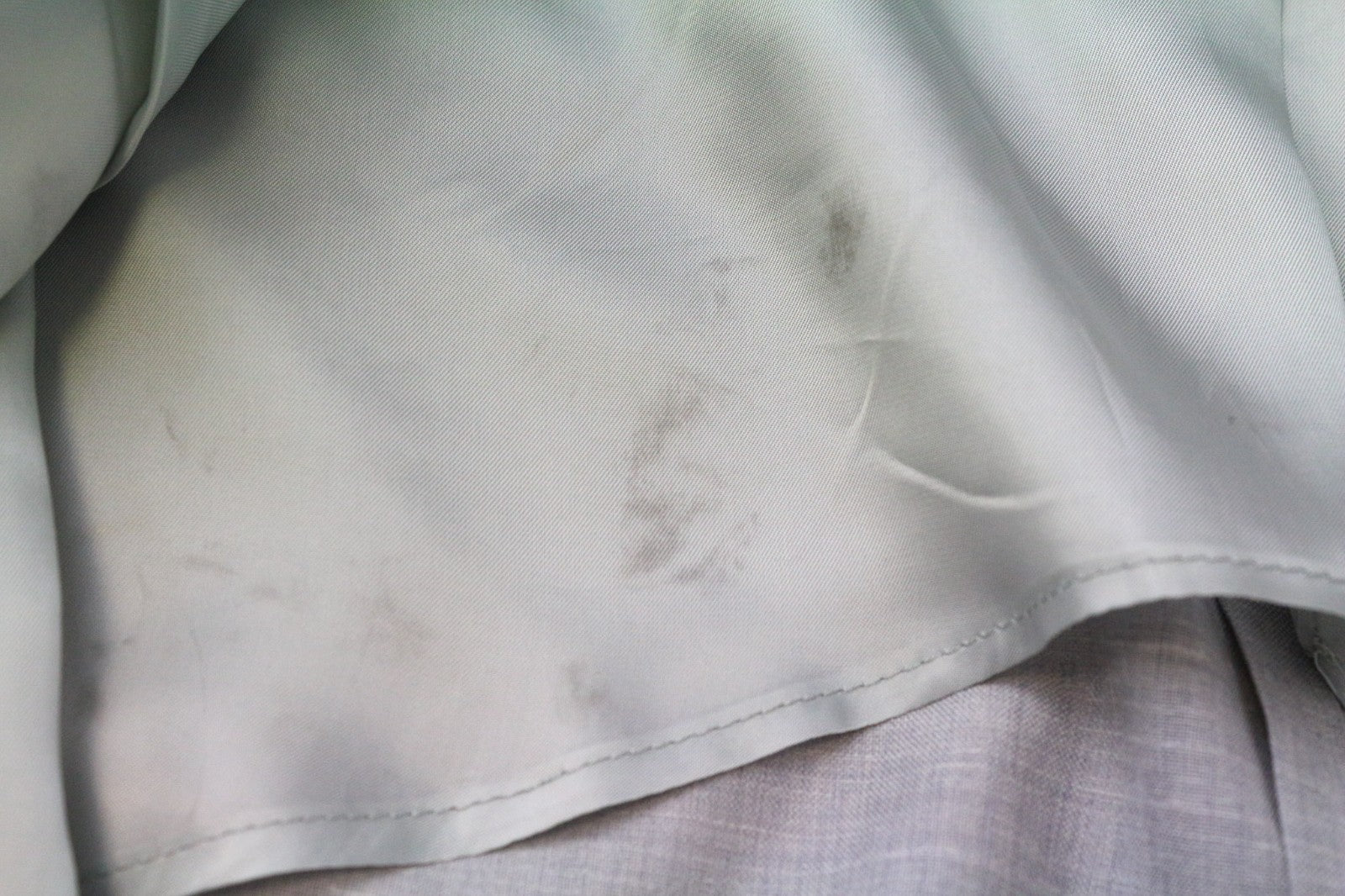 Stained blazer's lining and right sleeve, slightly stained trousers' waistline area. Stitched up slight tear on the left shoulder. Please see added photos.