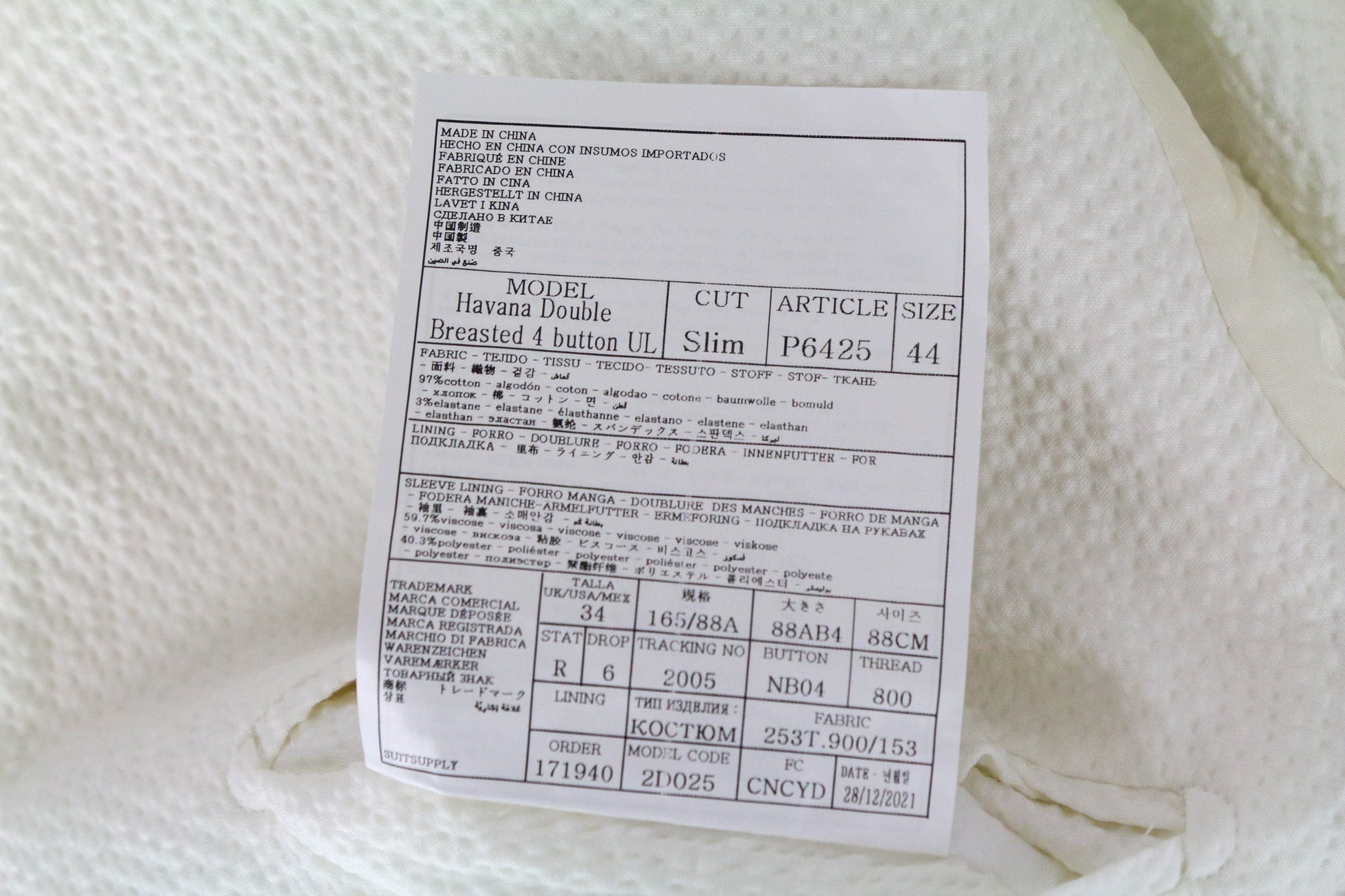 SUITSUPPLY Havana Men's Suit UK34R White Slim Double-Breasted Cotton Stretch 2Pc