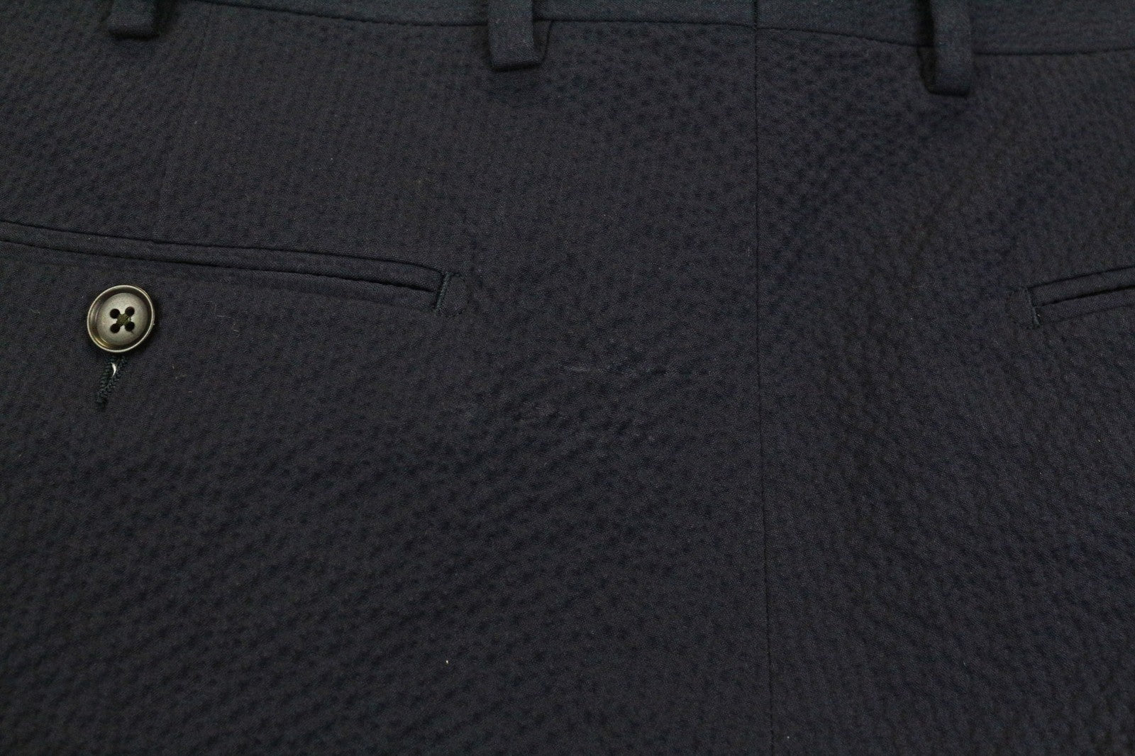 Mended sleeves, shiny imprints on the trousers front and back. Faded mark on the blazer's front. Please see added photos.