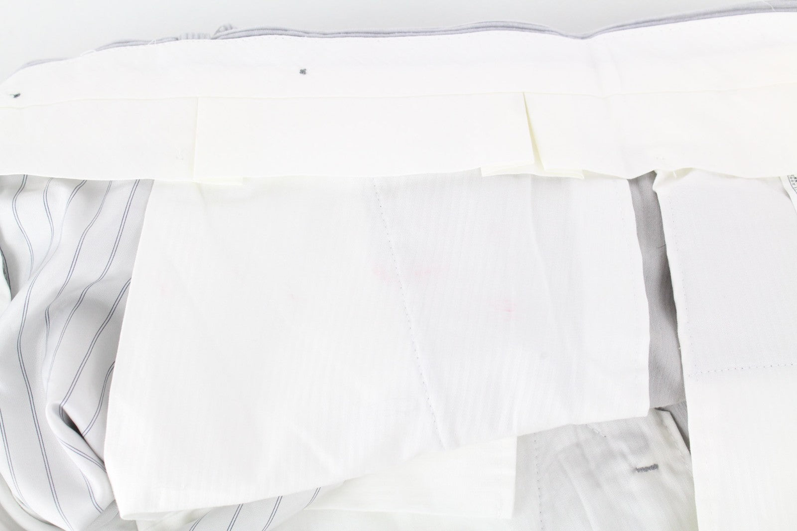 Used. Mended waistline. Stains on the pocket lining, stain on the blazer's lining, front and back. Stain on the trousers' back. Please see added photos.