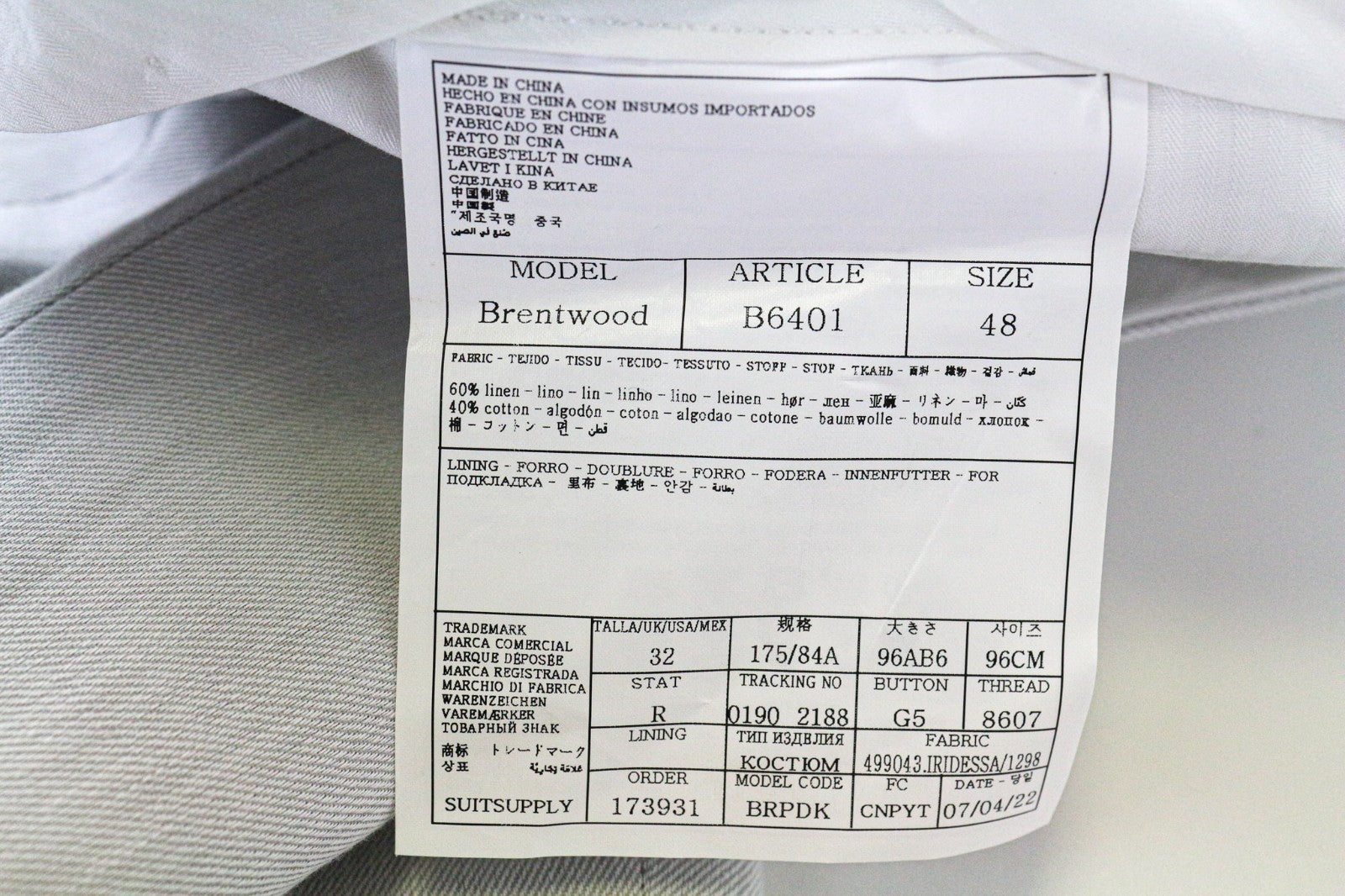 SUITSUPPLY Havana Patch Men's Suit UK38R Grey Slim Half-Lined Linen Cotton 2Pc