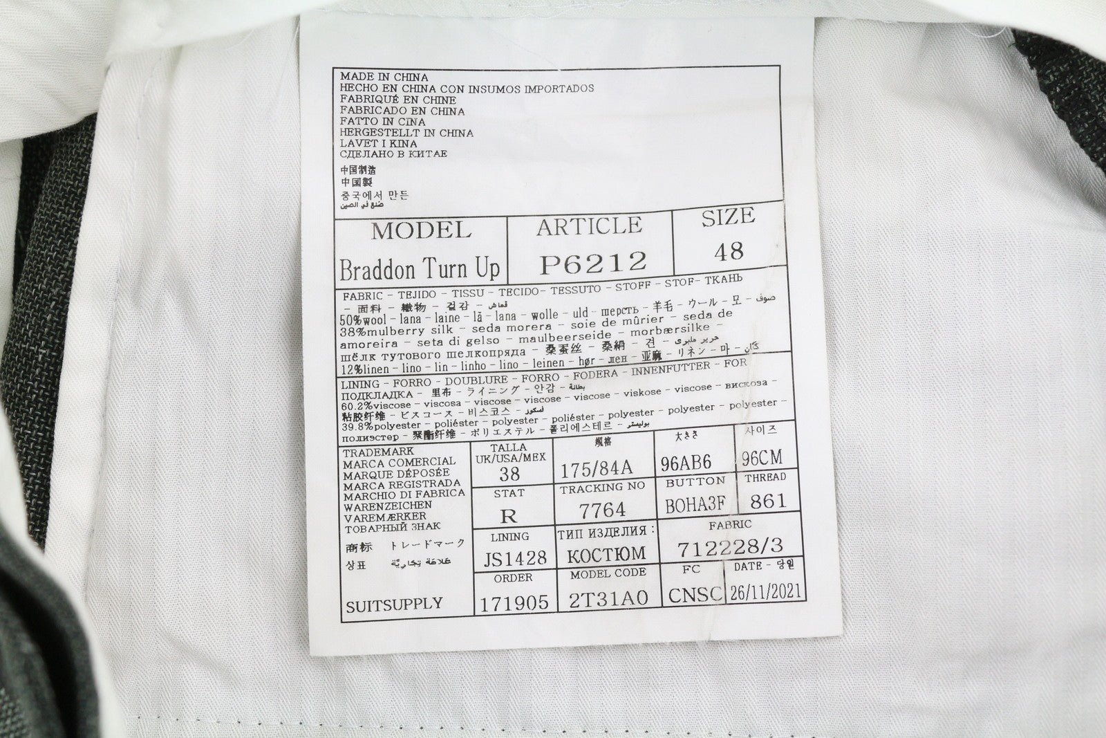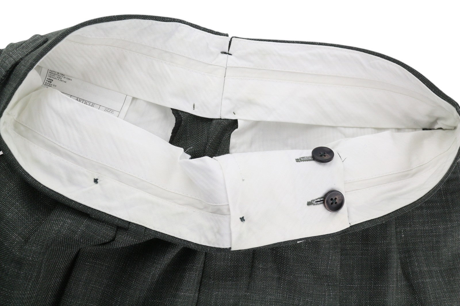 One sleeve button slightly split. Small stains inside the trousers waist. Please see added photos.