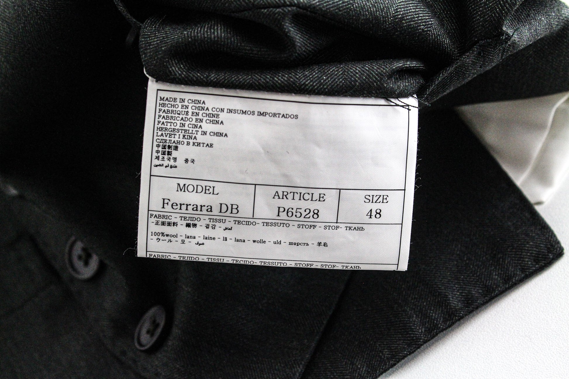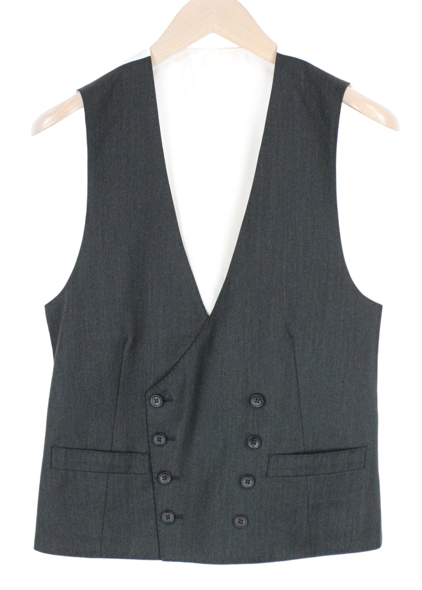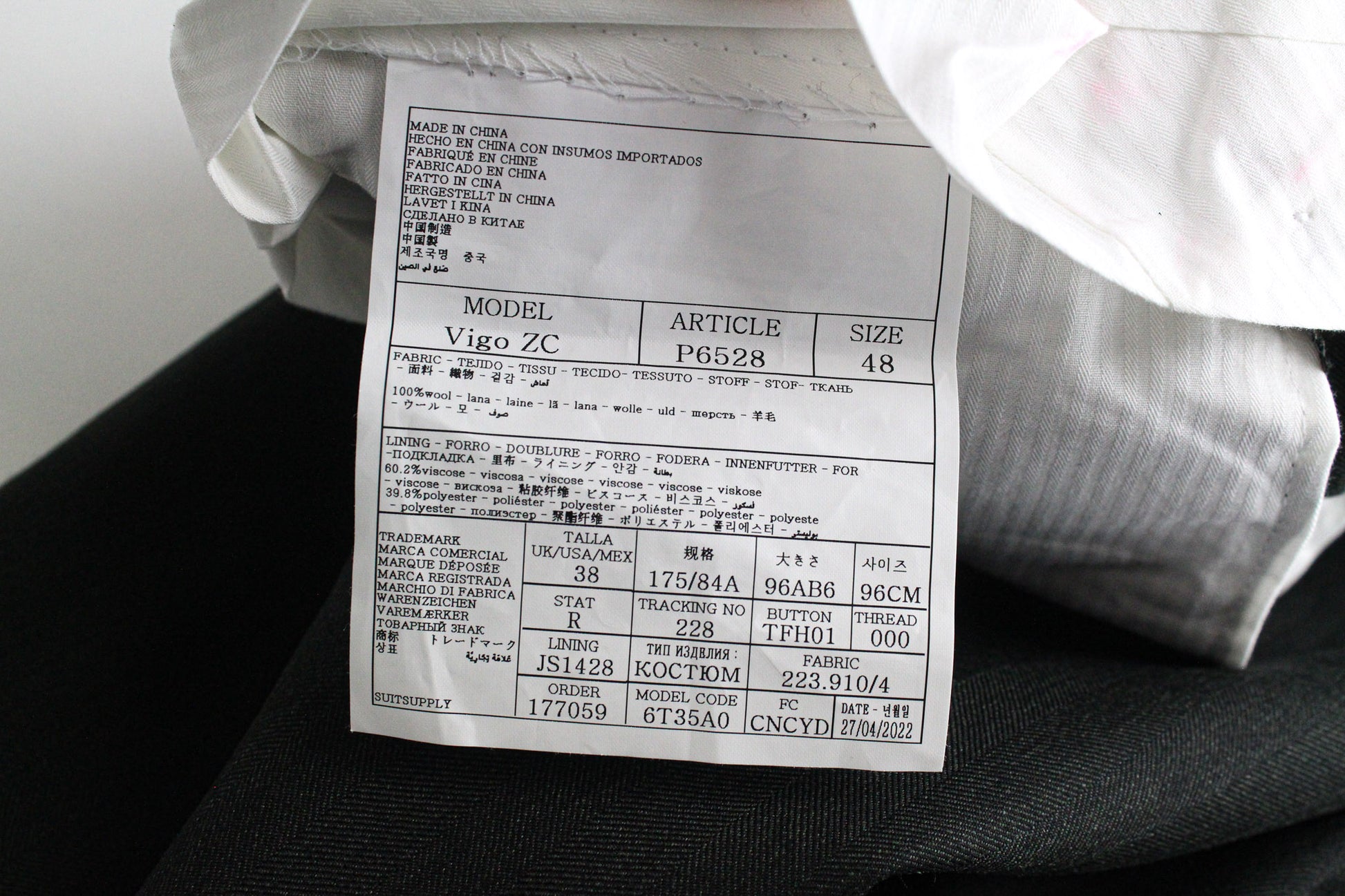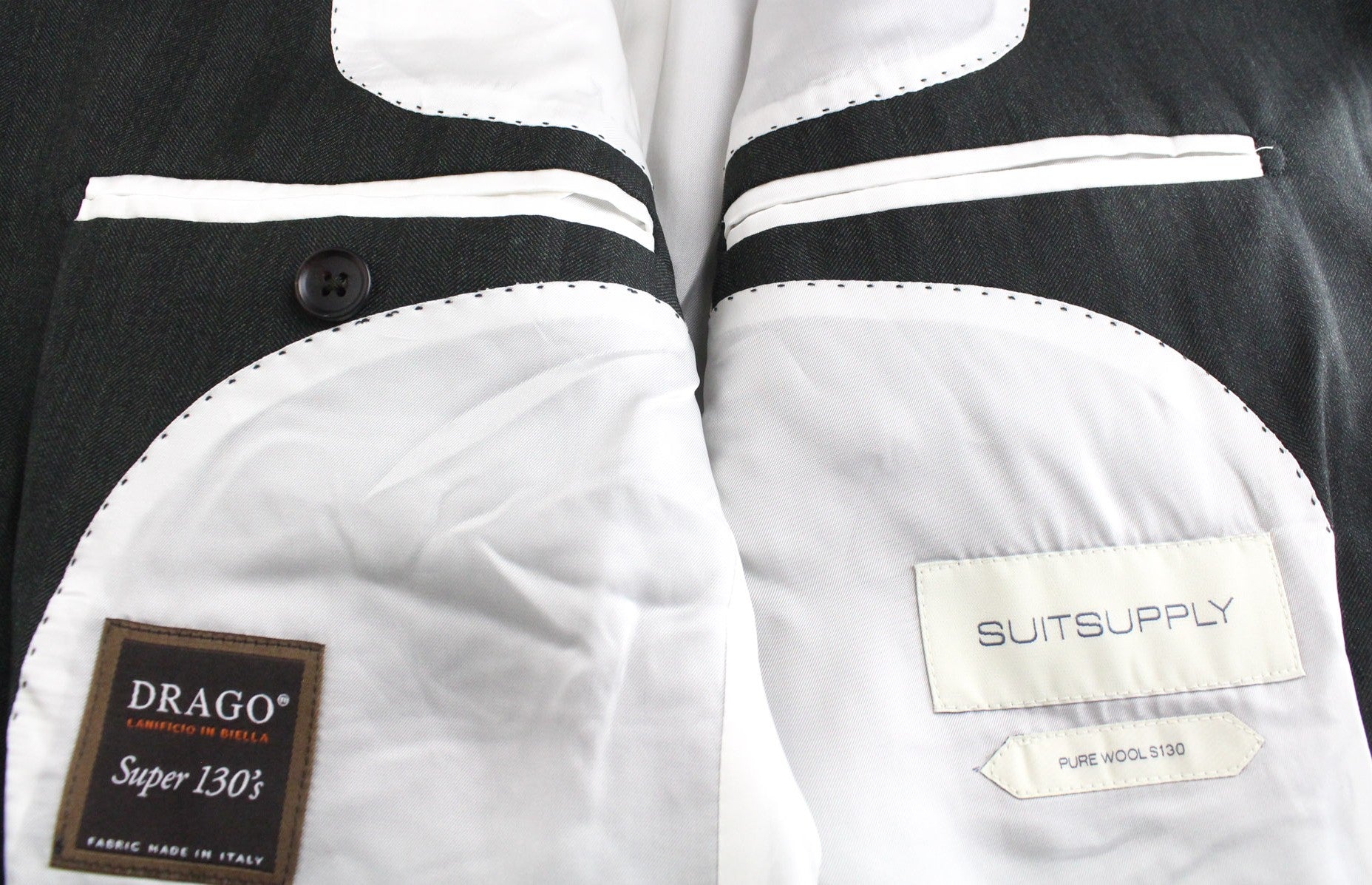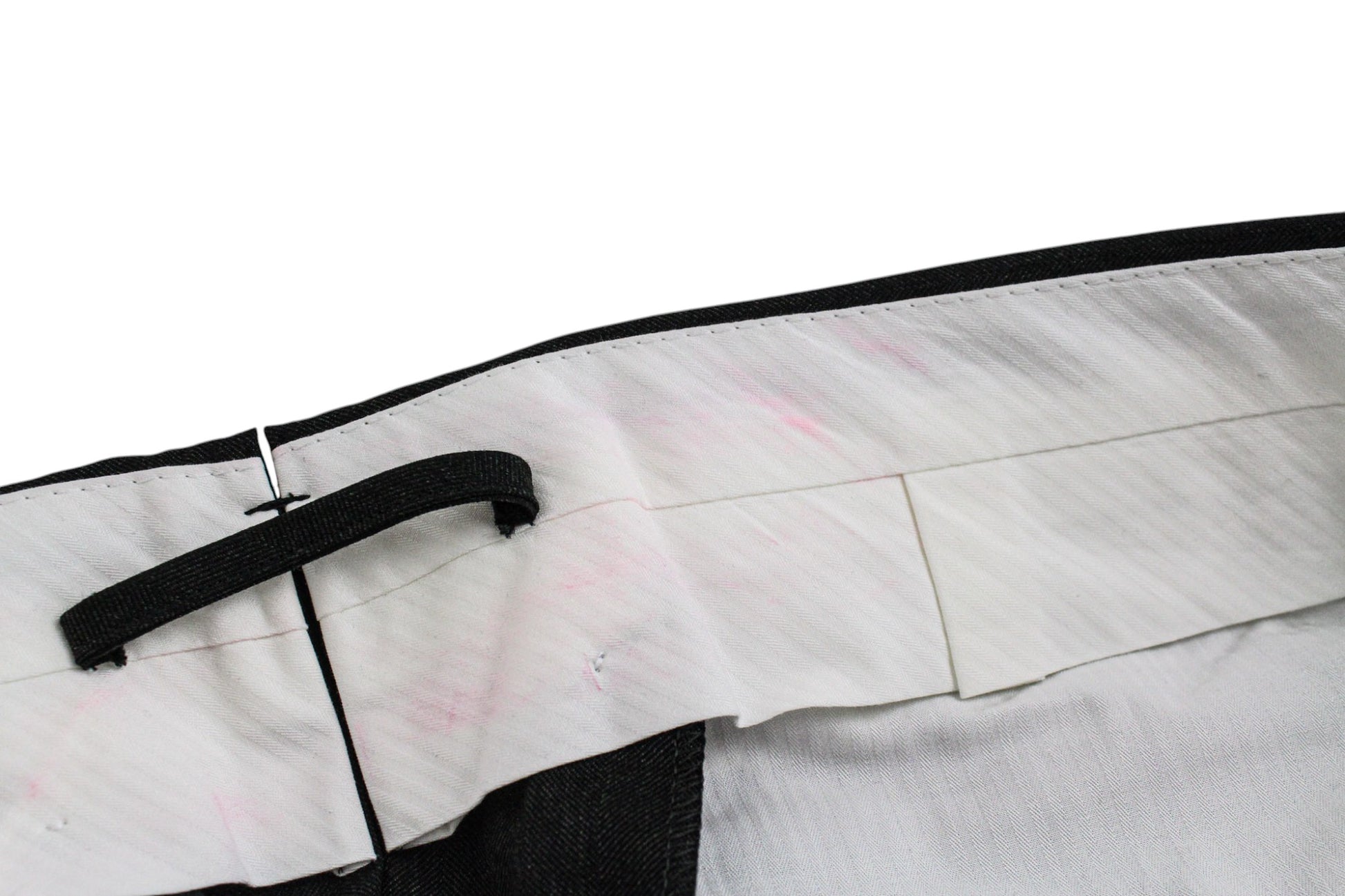 Used. Stained waistline on the inside. Pulled threads on the lapel and right leg at the back. Please see added photos.