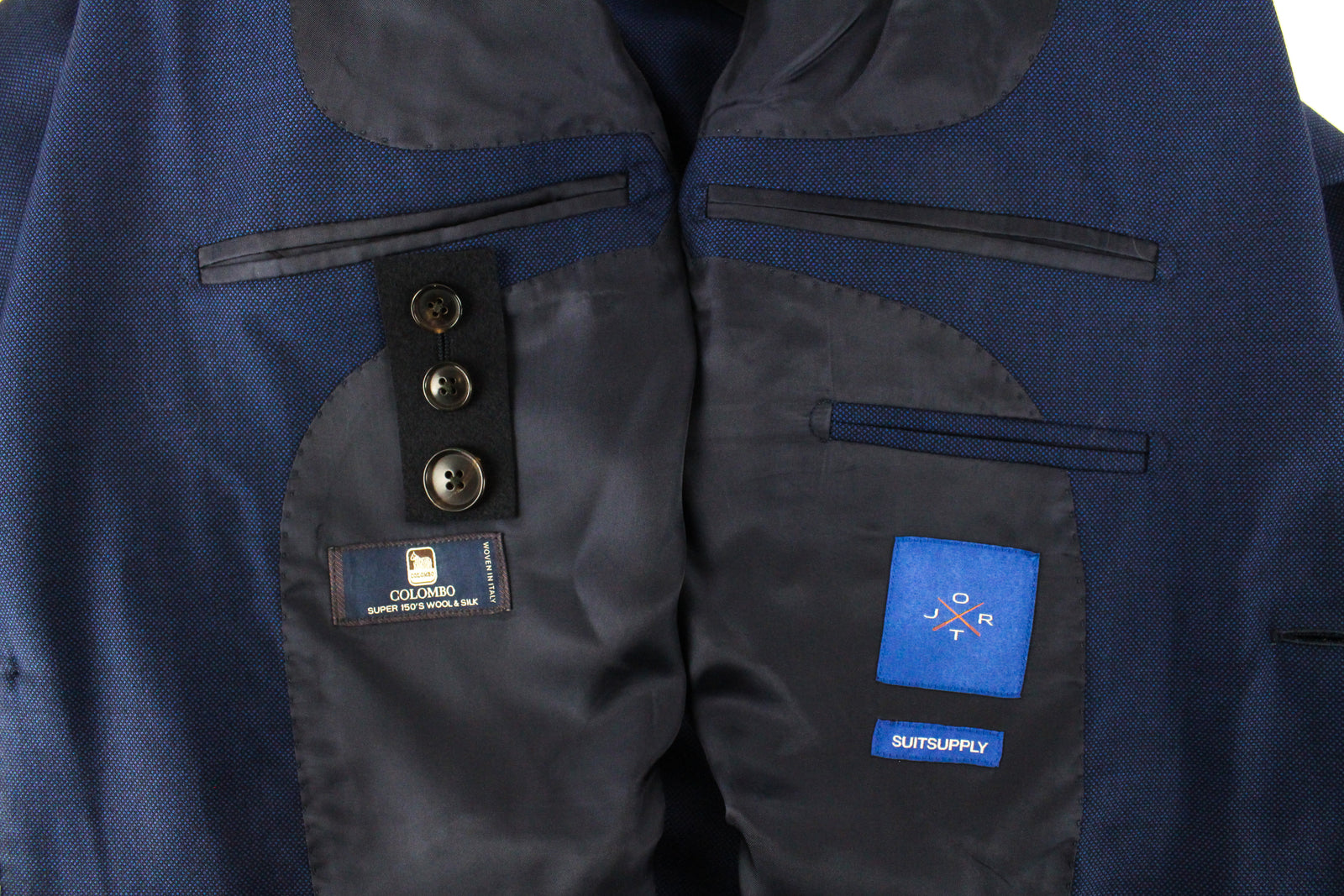 „SUITSUPPLY Jort“ vyriškas mėlynas languotas vilnonis šilkinis švarkas su languotu raštu, UK40L, plonas kirpimas