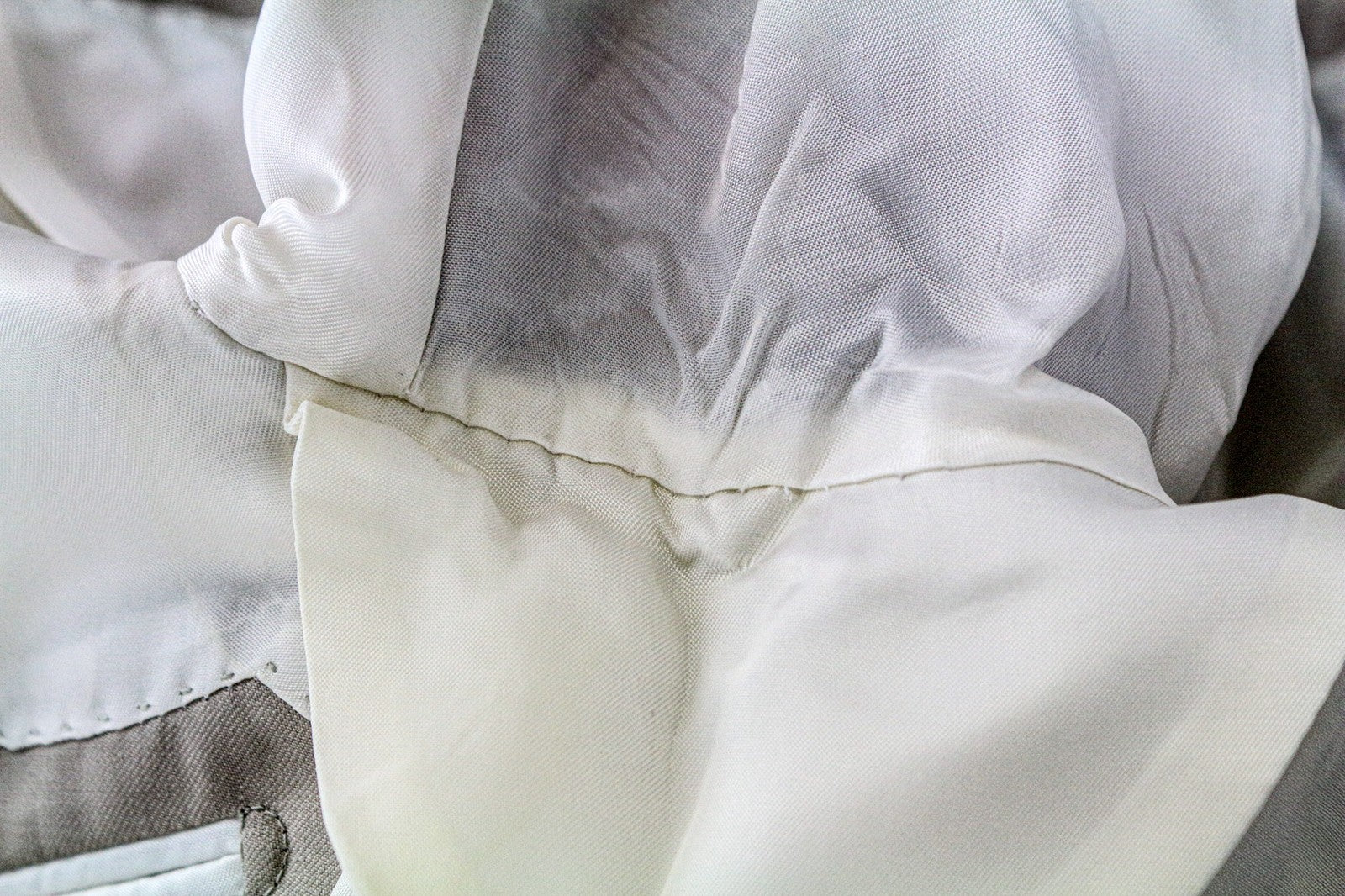 Used. Stained around armpit area. Pay attention to personal embroidery. Please see added photos.