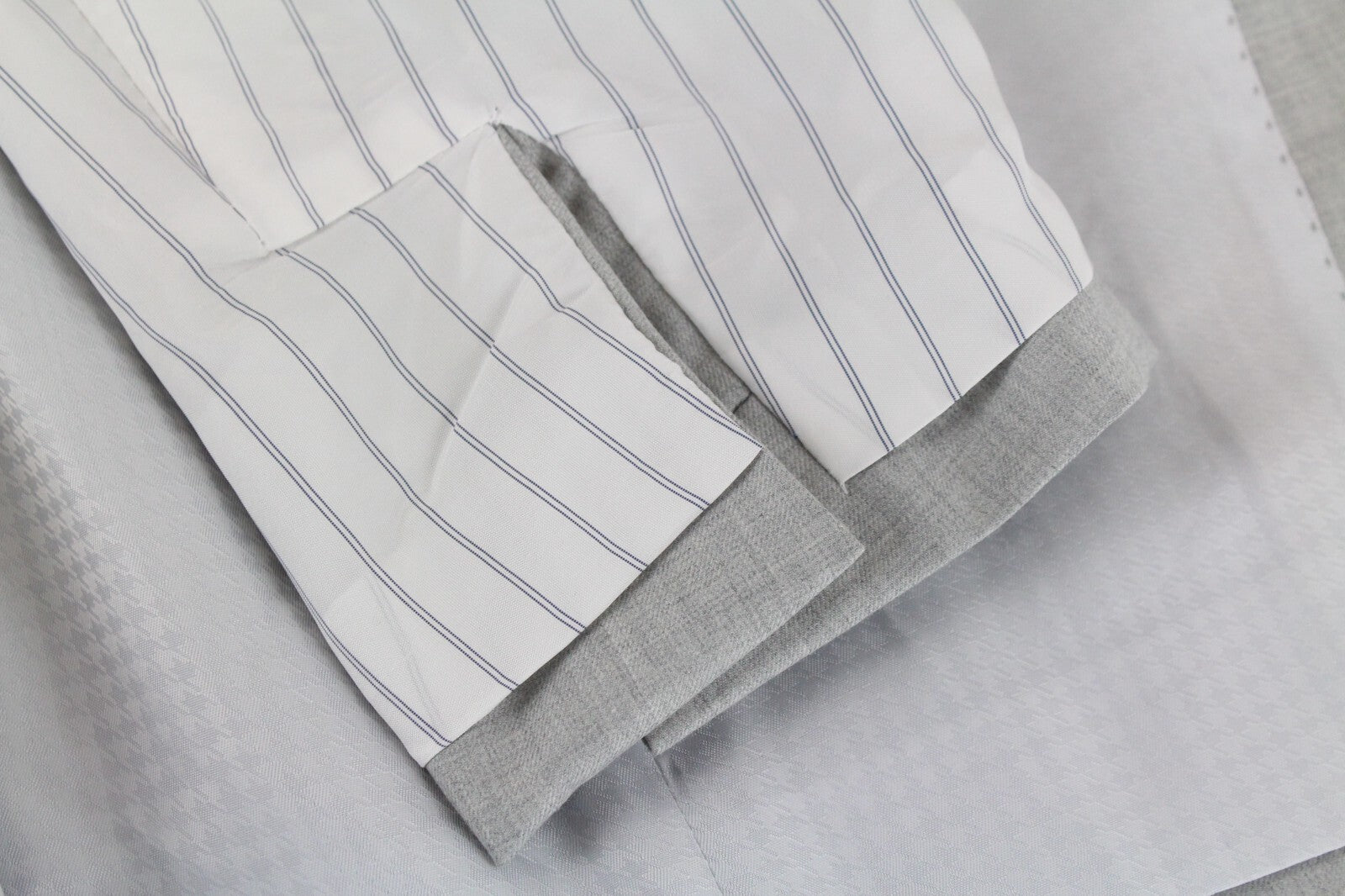 SĄLYGA: New with defects. Mended sleeve length and hems' and waistline (trousers) lengths. Pay attention to the embroidered initials on the blazer's lining and neck. Please see added photos.
