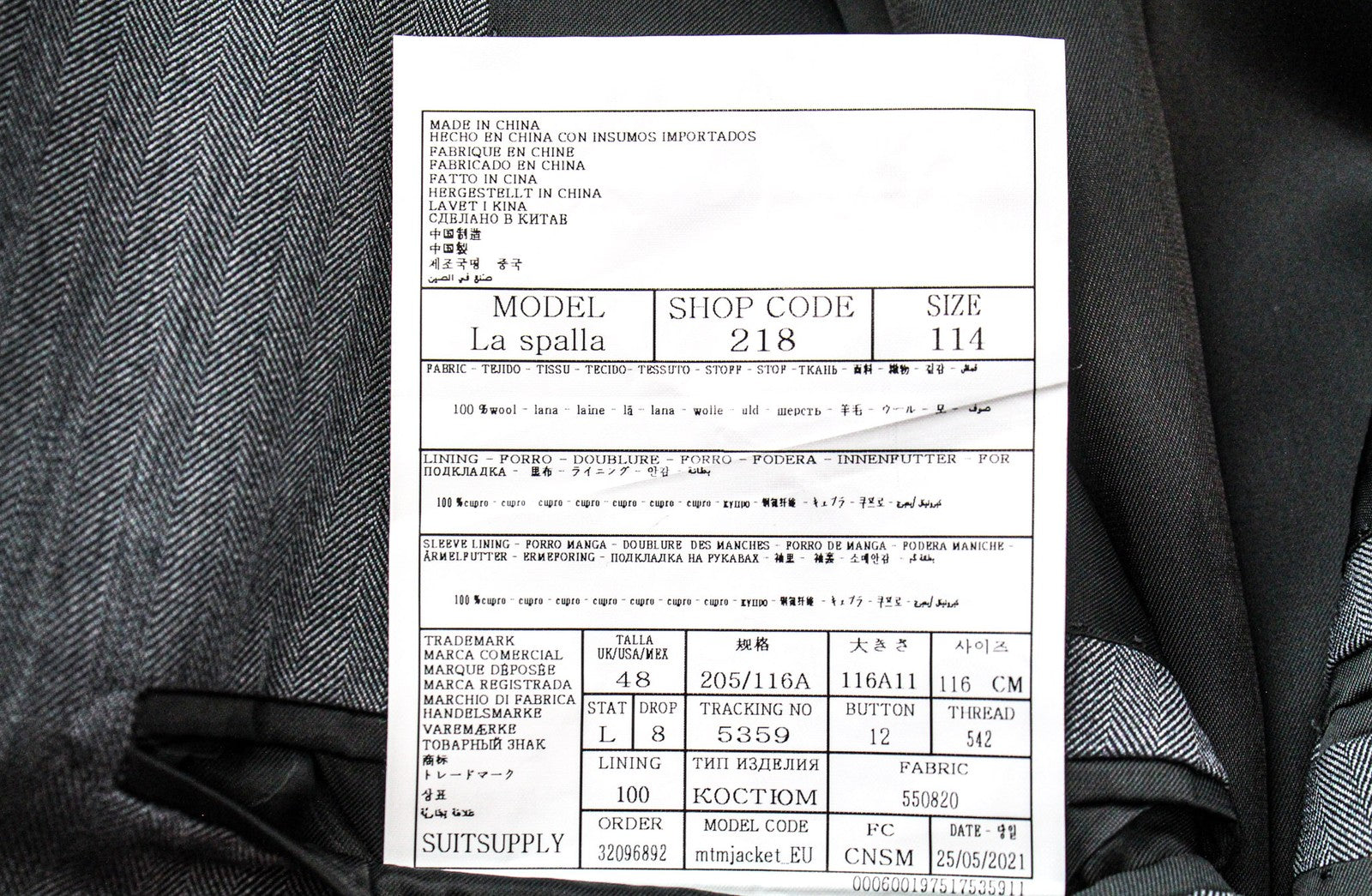 SUITSUPPLY La Spalla vyriškas pilkas vilnonis pamušalas, vienaeilis švarkas, UK48L