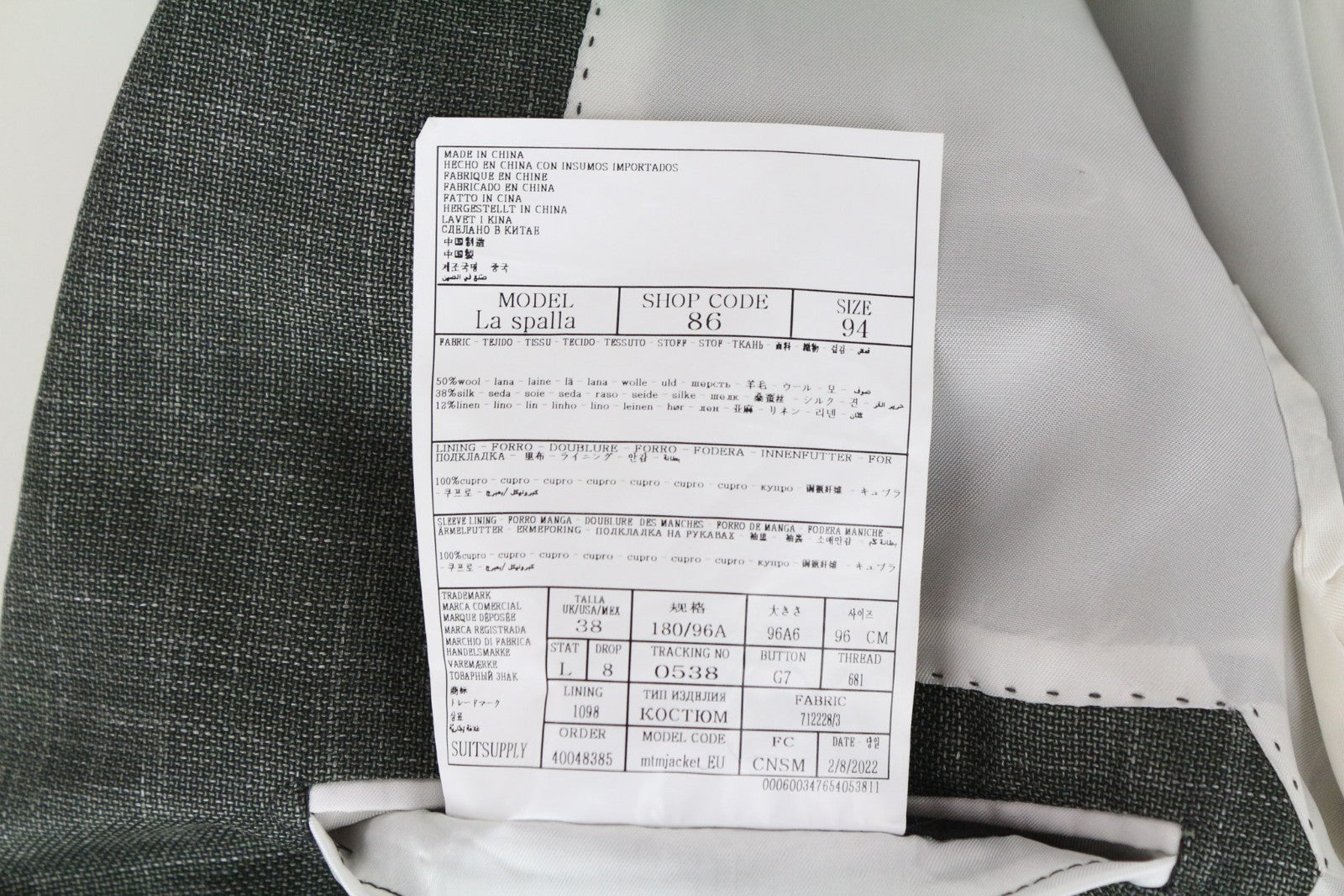 SUITSUPPLY La Spalla Men's Suit UK38L Green Wool Silk Linen 2Pc Single-Breast