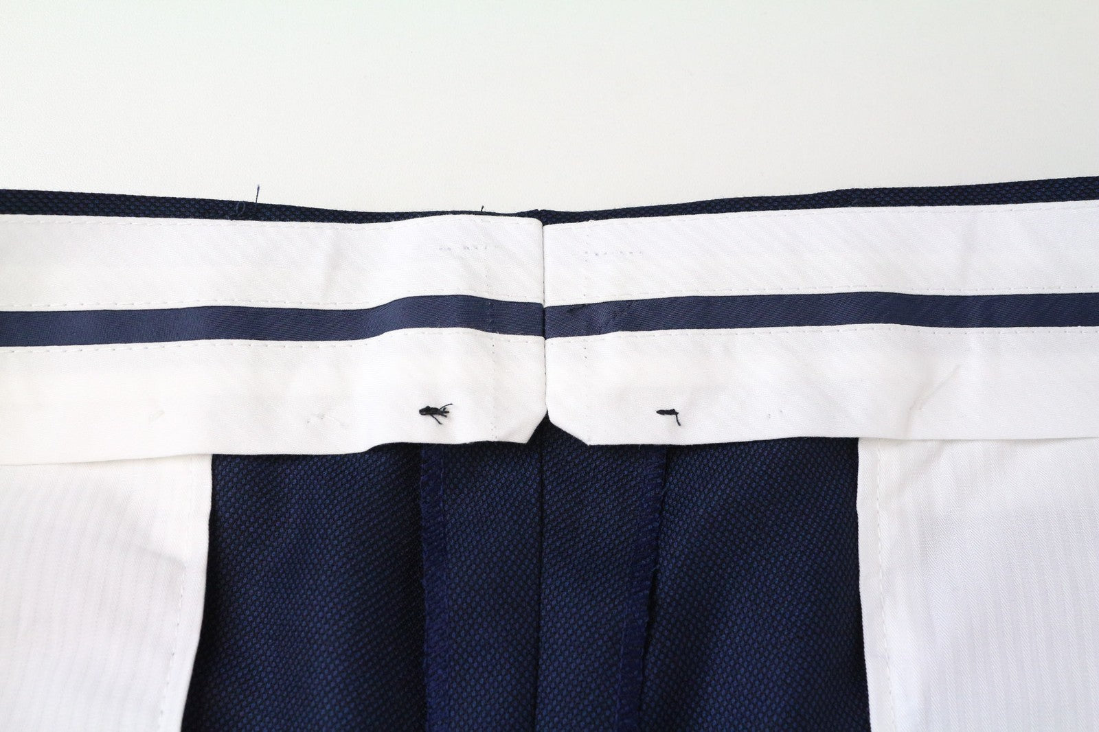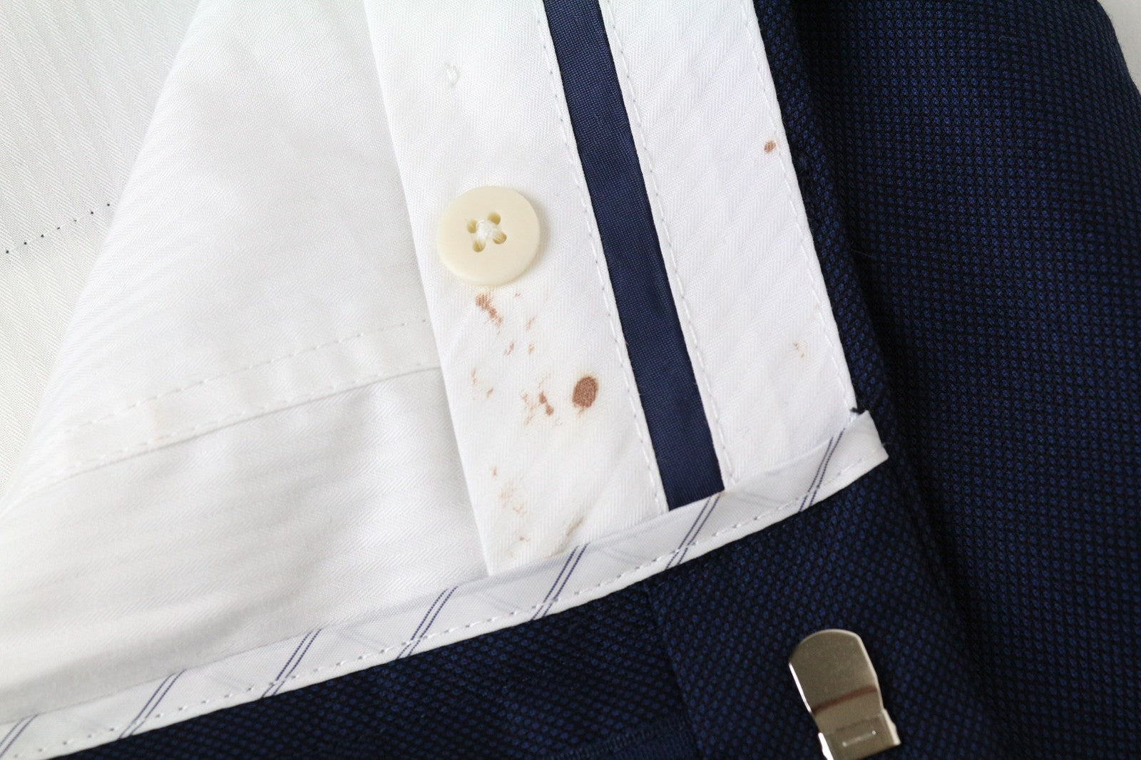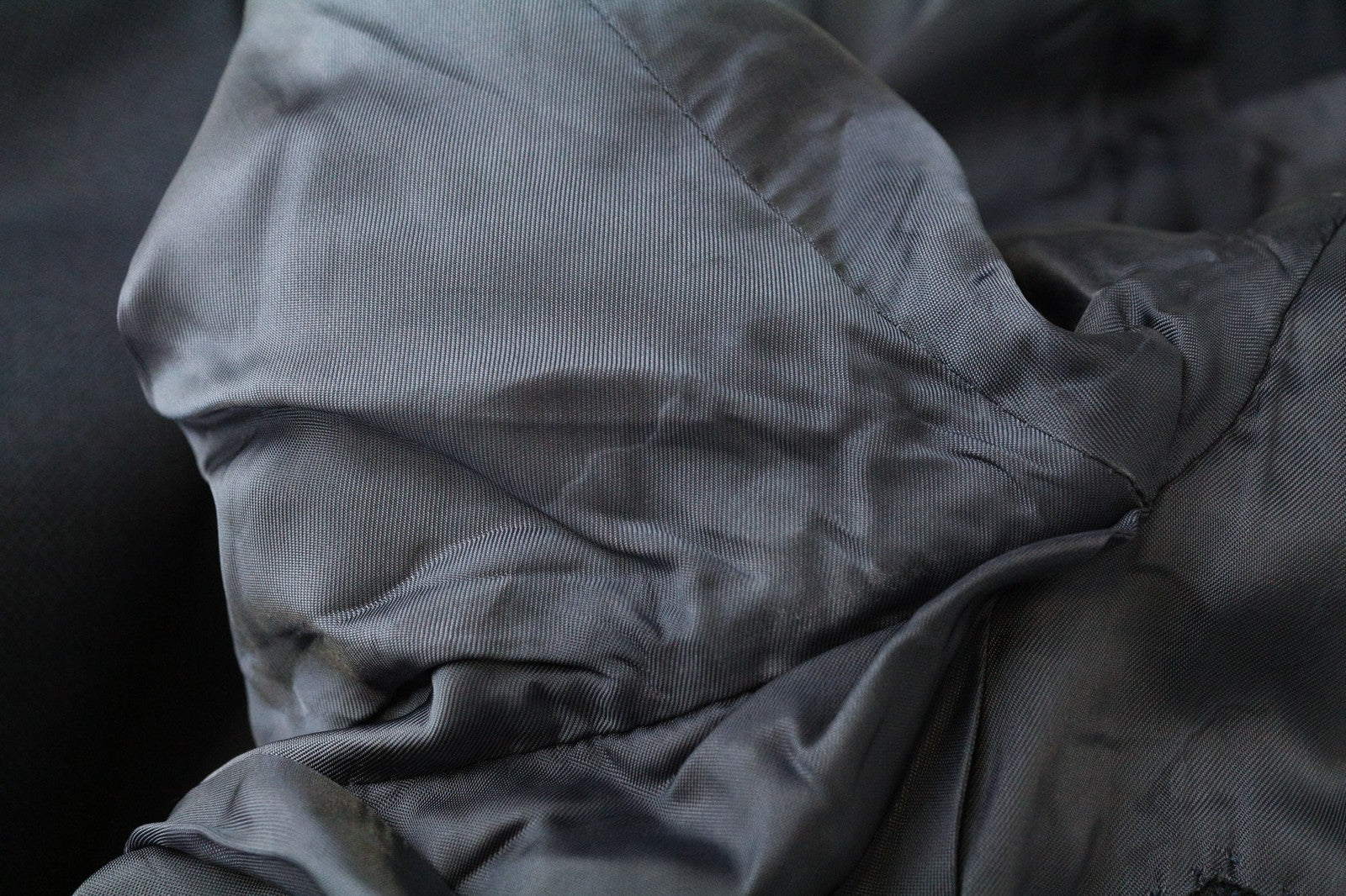 Mended hems and waistline, stains on the inside. Pulled threads on the blazer's front, stained armpit area on the inside. Please see added photos.