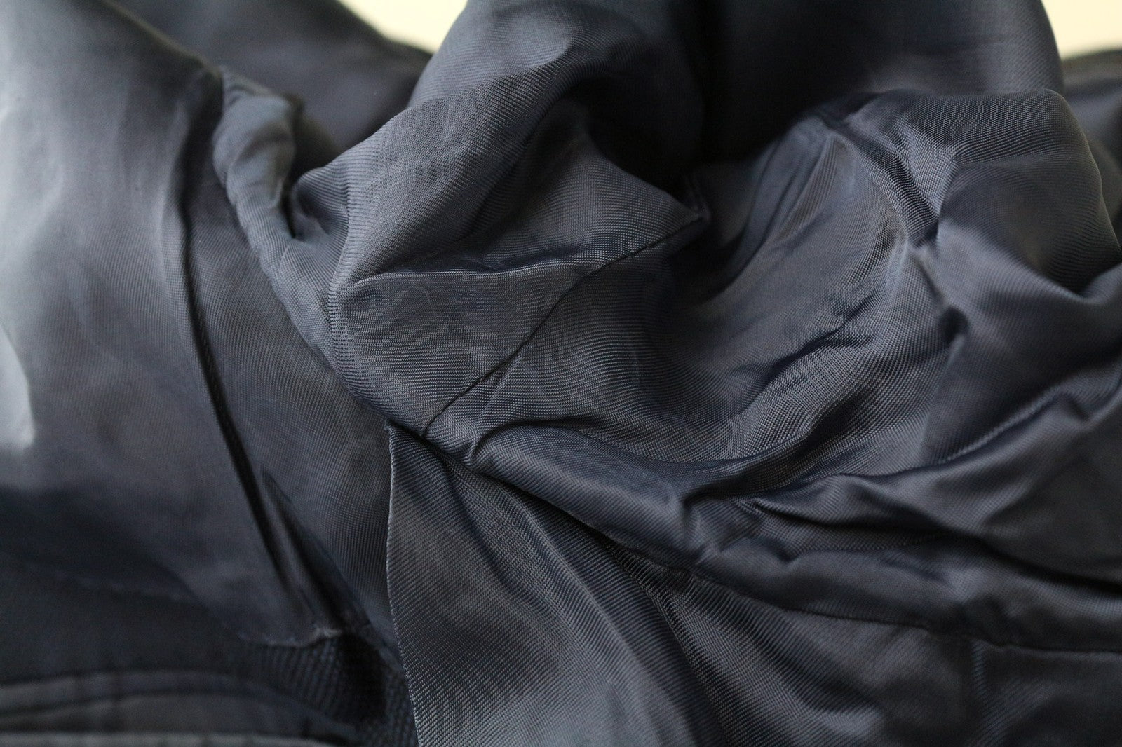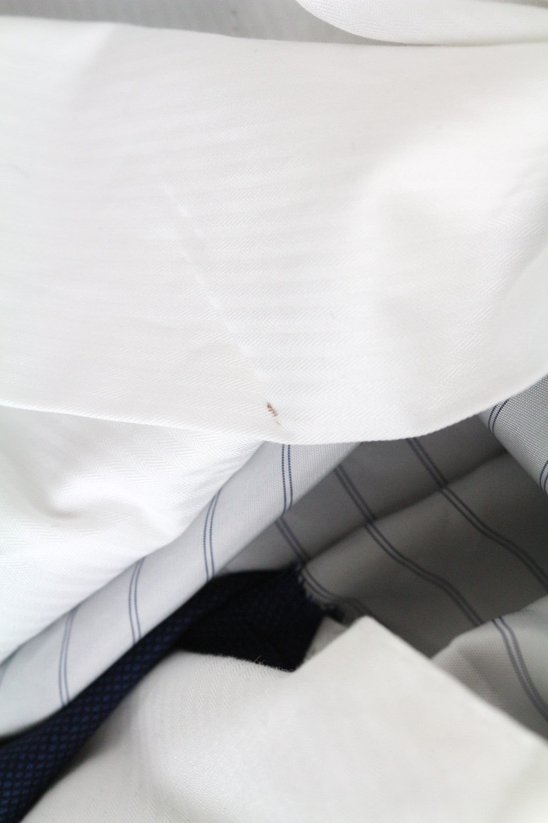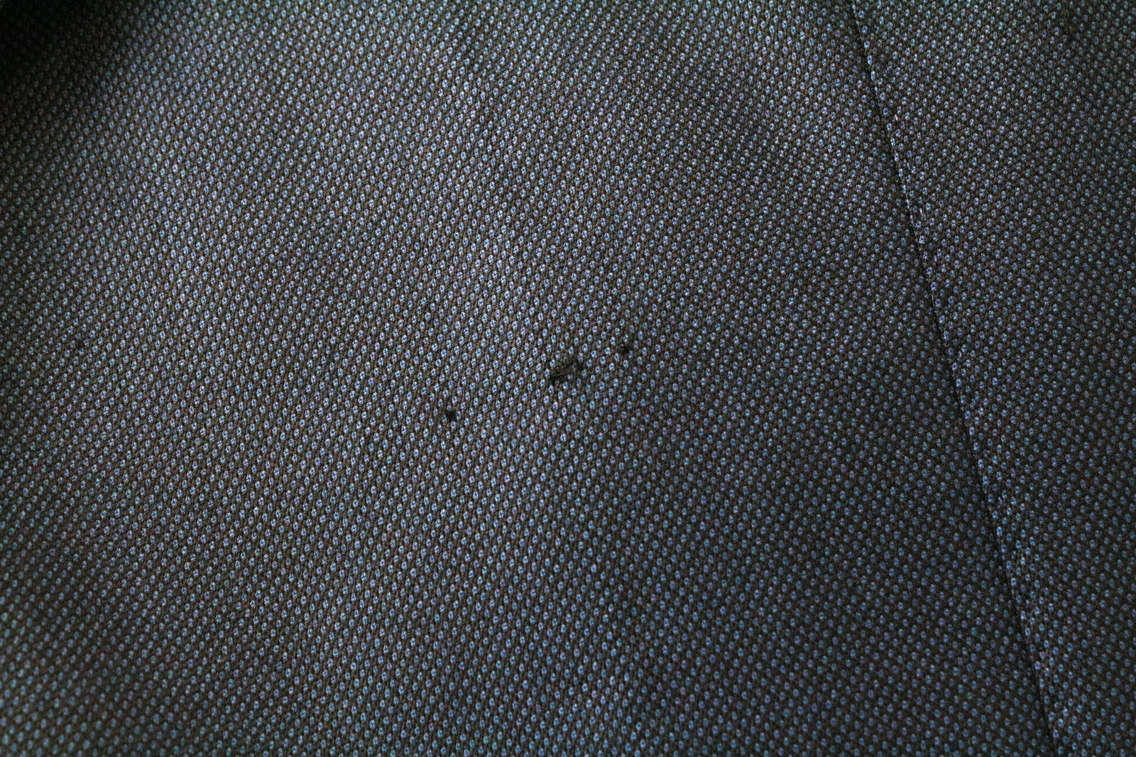 Mended hems and waistline, stains on the inside. Pulled threads on the blazer's front, stained armpit area on the inside. Please see added photos.