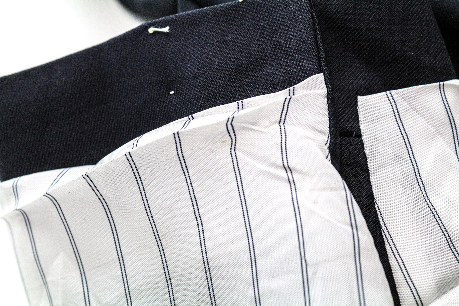 Used. Pulled threads on both legs. Pulled threads on the blazer's lining. Please see added photos.