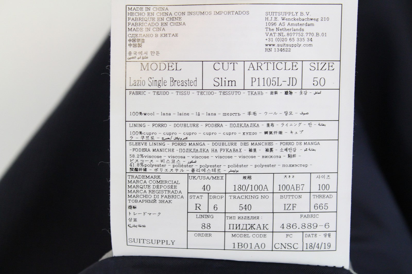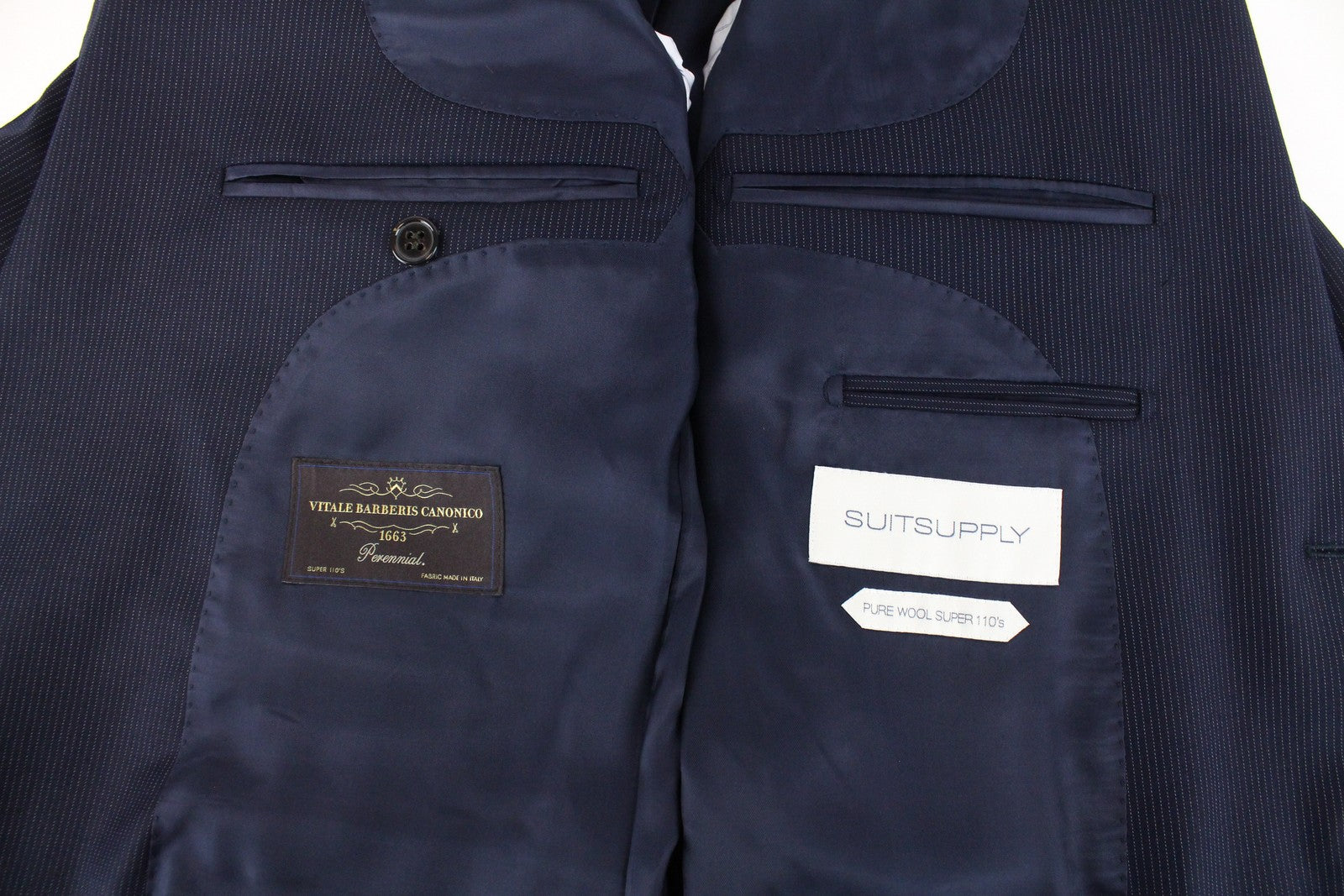 „SUITSUPPLY Lazio“ vyriškas švarkas UK40R, tamsiai mėlynas, vilnonis „Super 110“ plonas dryžuotas pamušalas