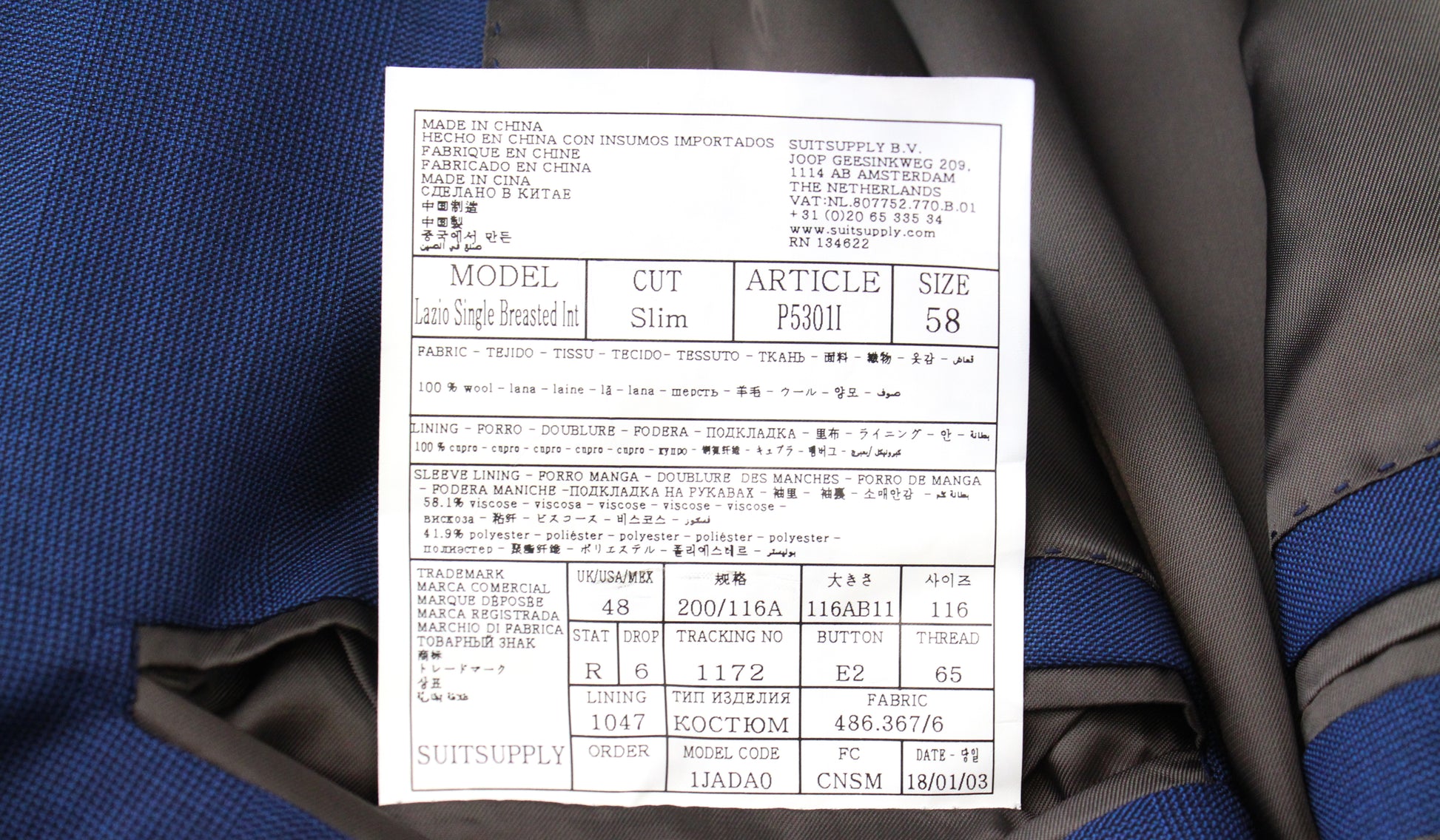 SUITSUPPLY Lazio vyriškas mėlynas vilnonis švarkas „UK48R“ plonas, klasikinio kirpimo, „Super 110's“