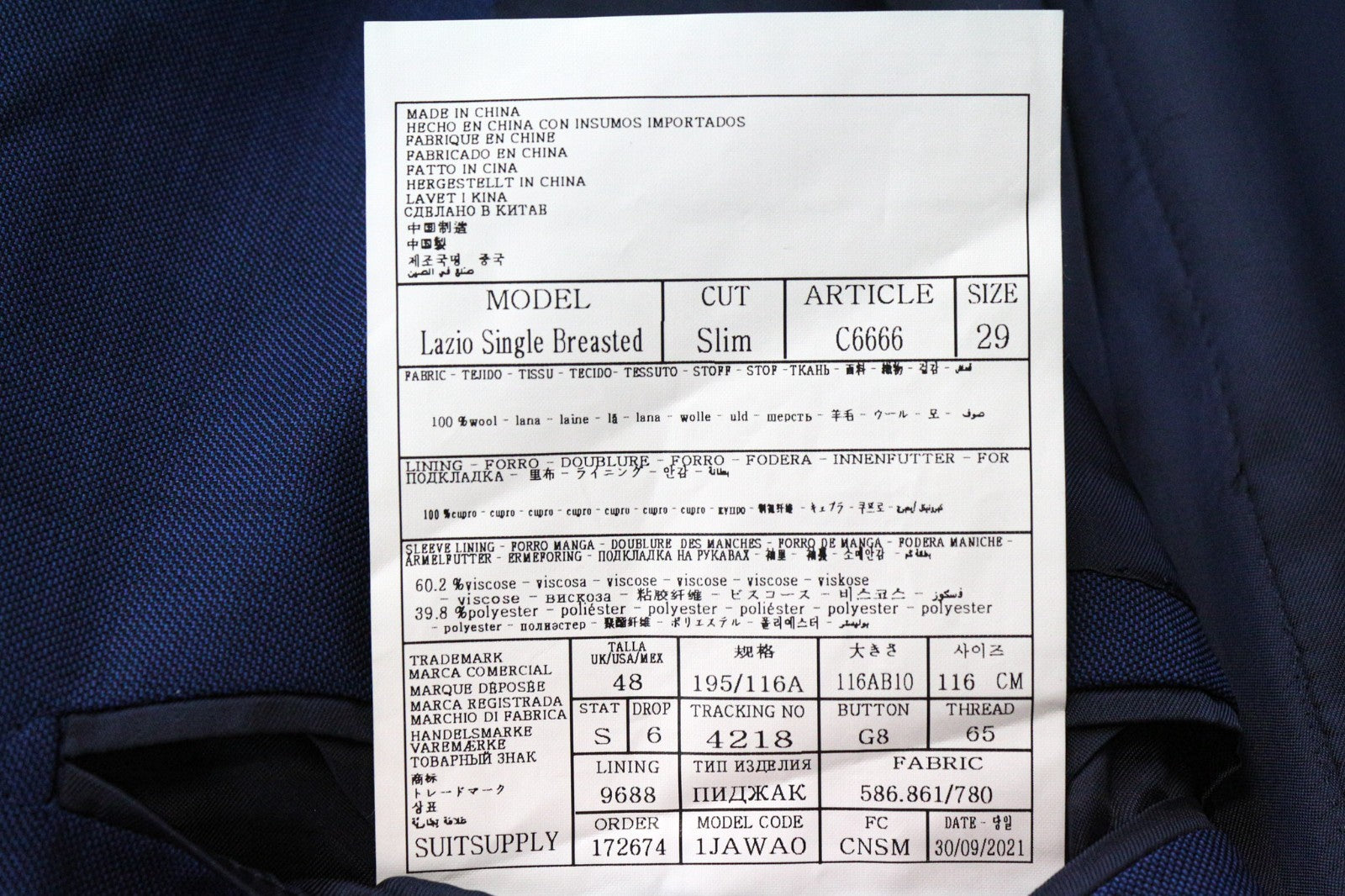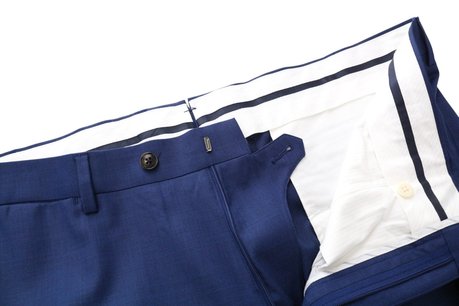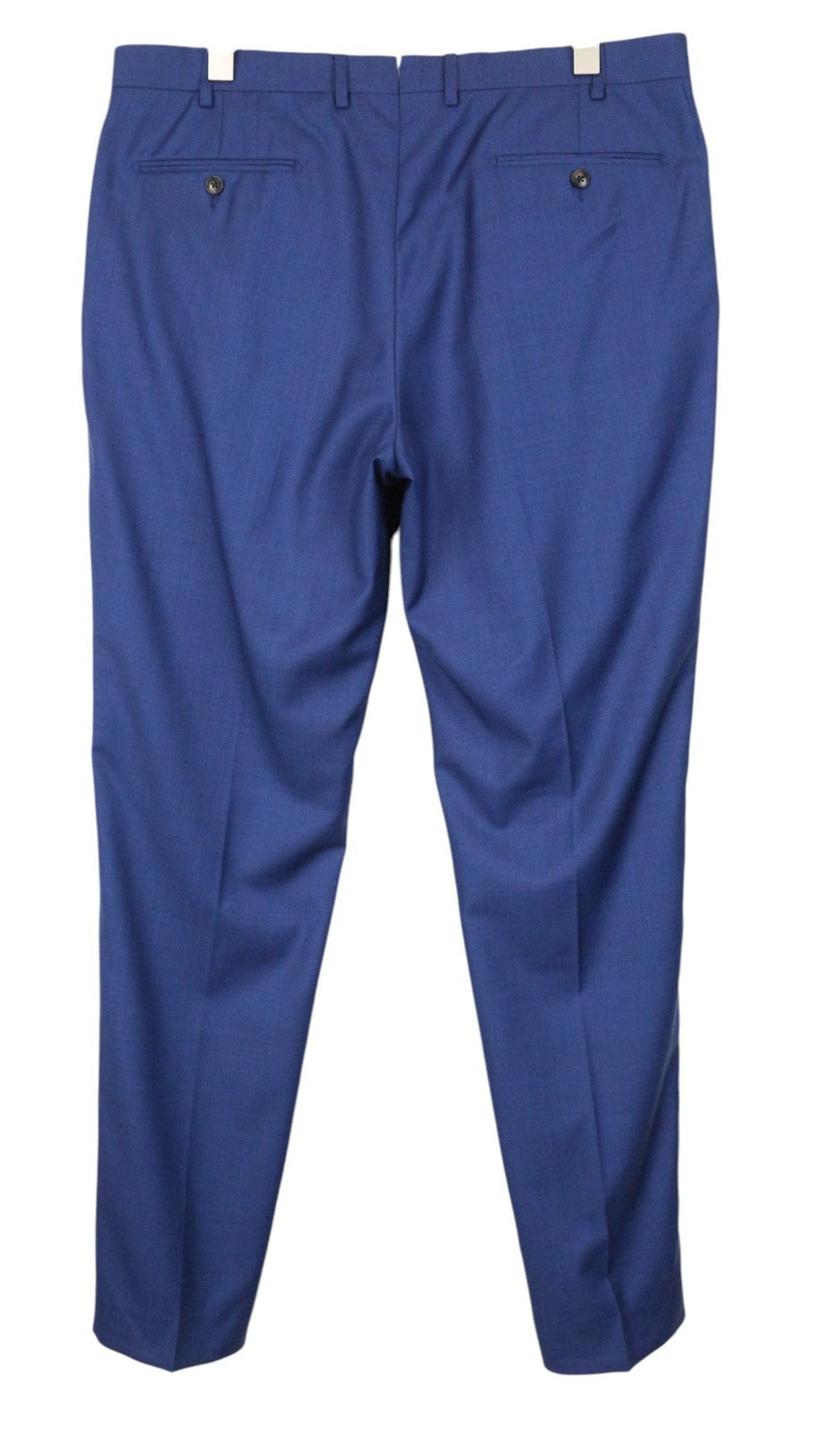 Used. Slight tears on the blazer's lining, altered back width and/or length, and sleeves' length. Tailored trousers' length on the inseam. Slight tear on the left leg and a pulled thread on the blazer's front. Please see added photos.