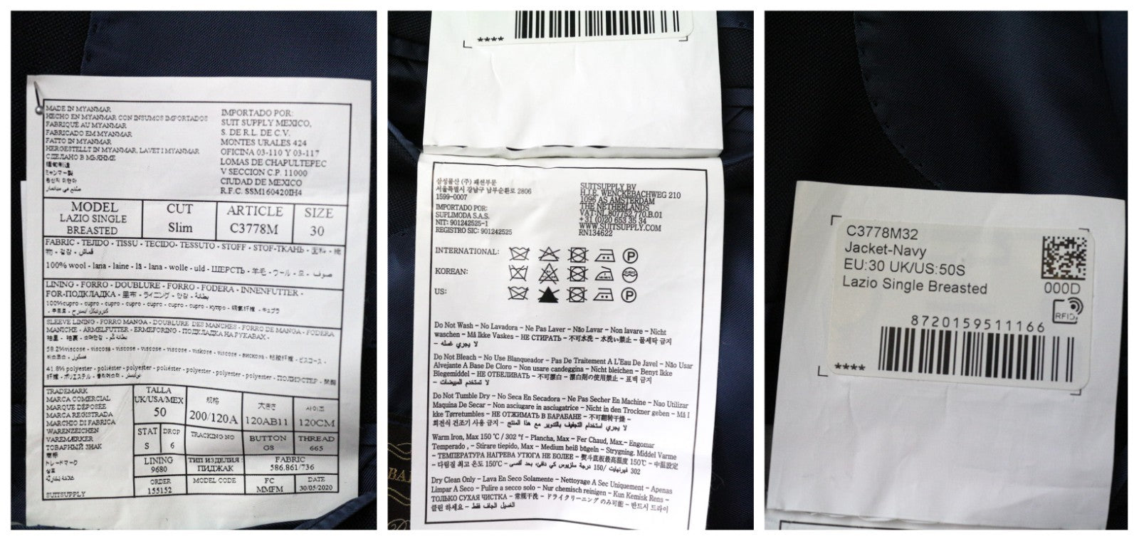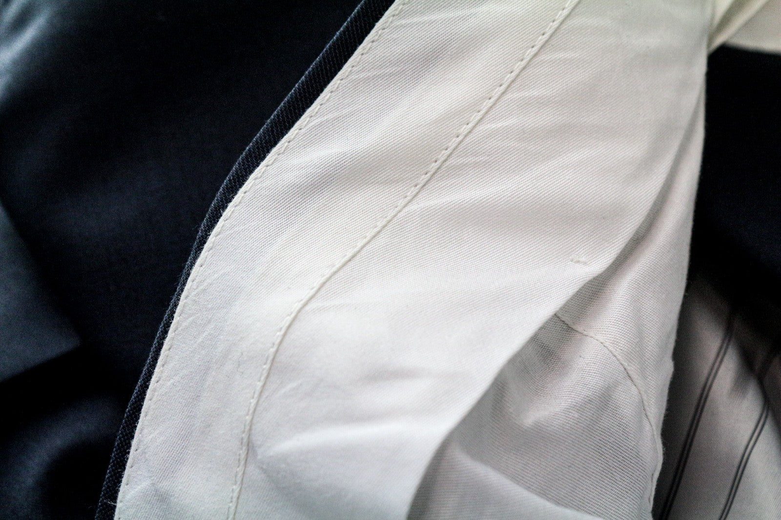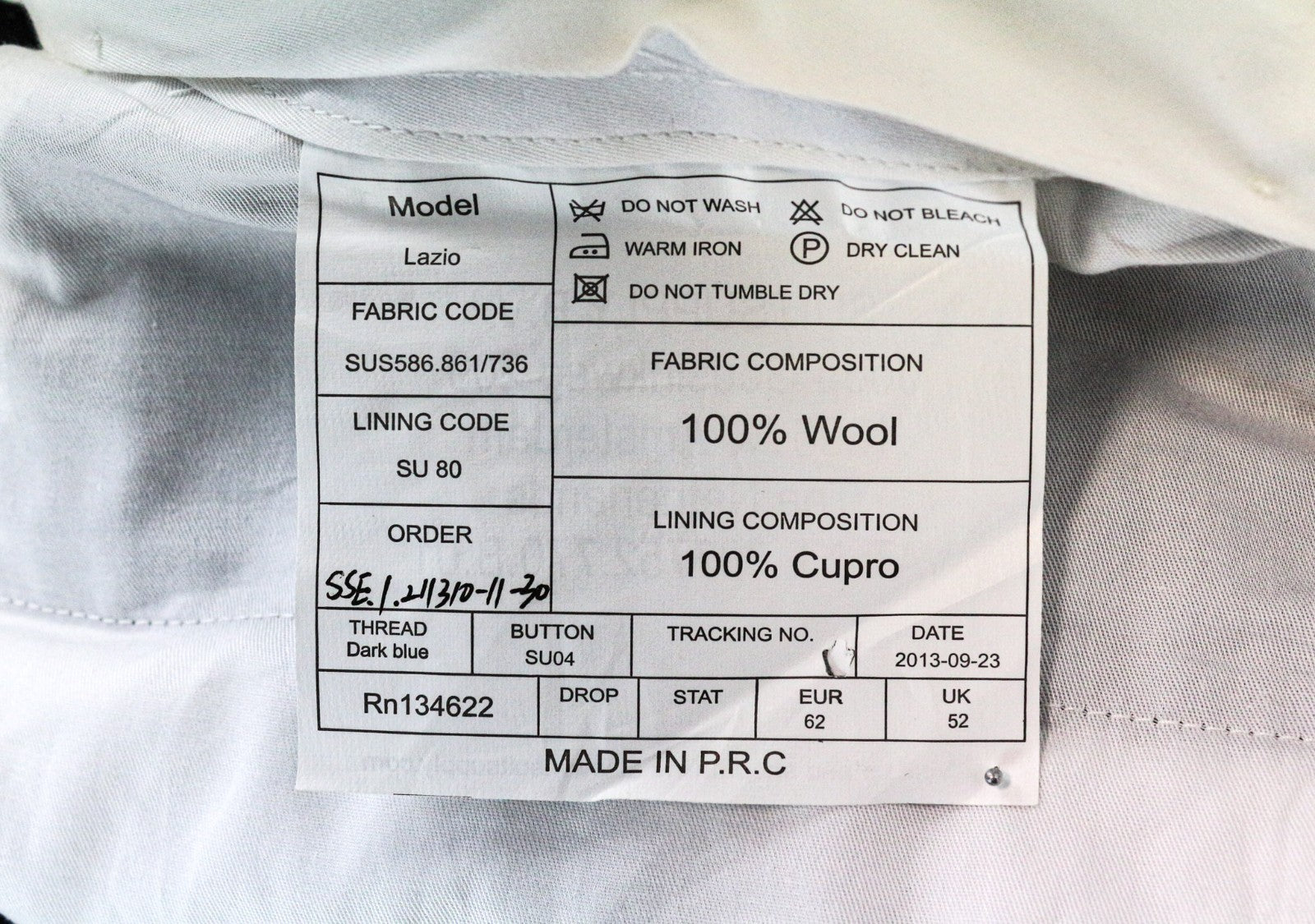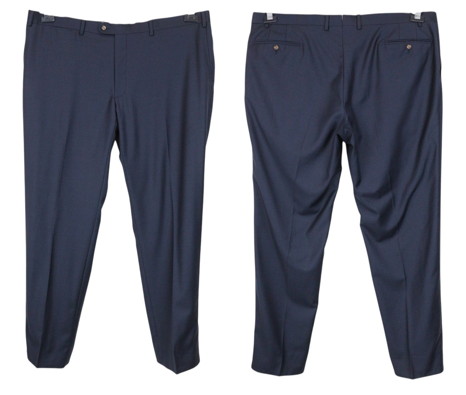 Used. Stained waistline. Slightly thinned out/rubbed off fabric around the middle trousers' seam. Tailored trousers' length. Please see added photos.