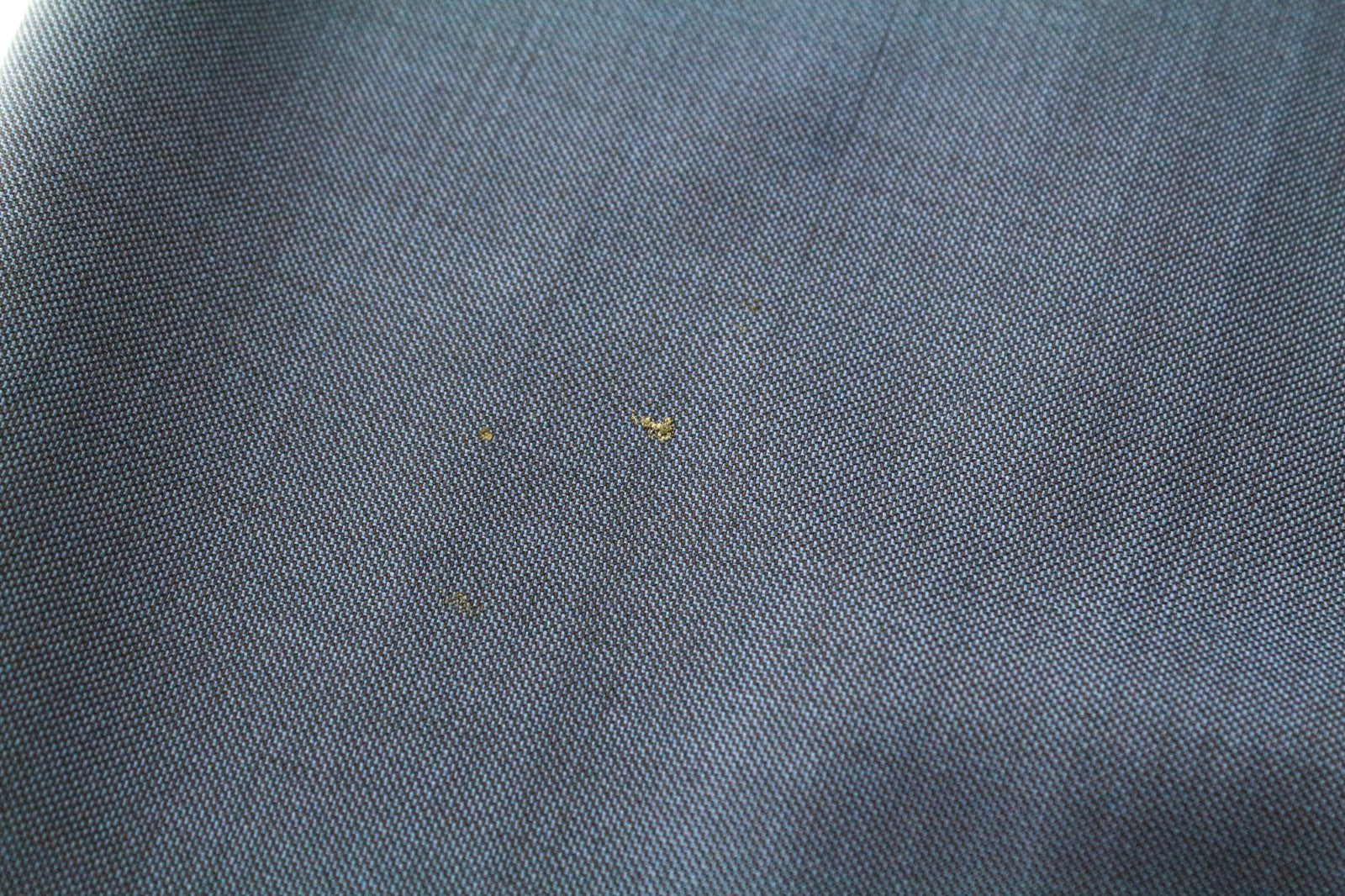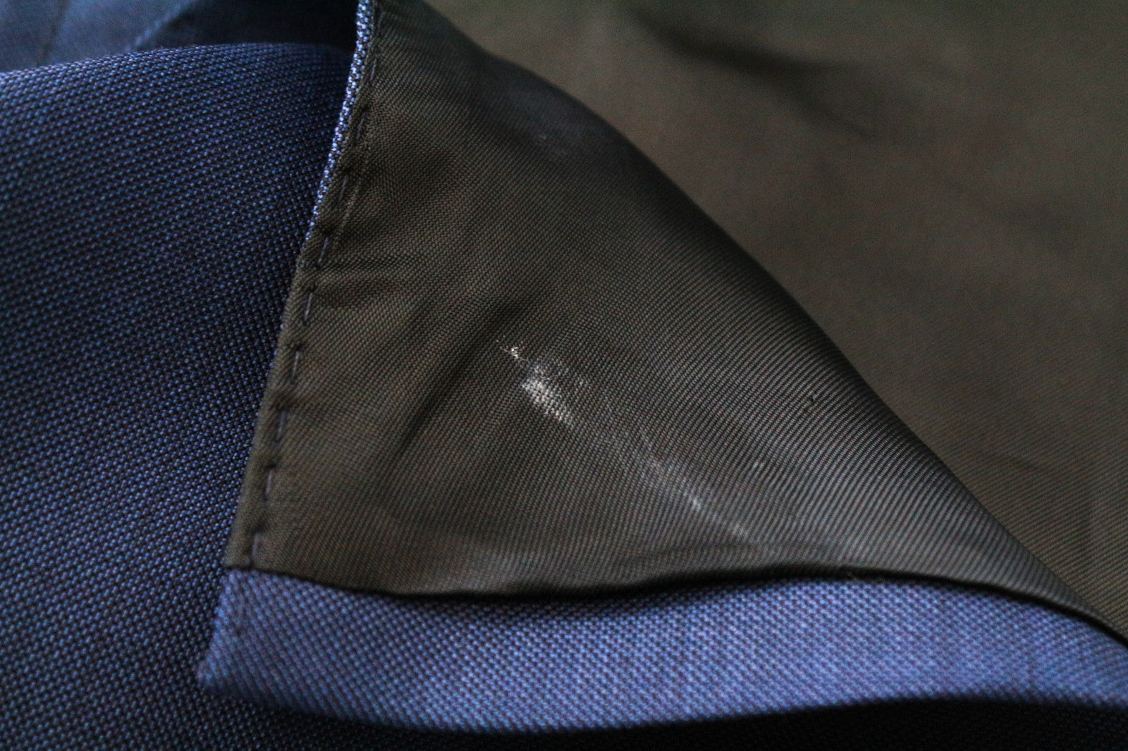 Tear in the back, stain on the lining. Stain on the left leg at the back. Please see added photos.
