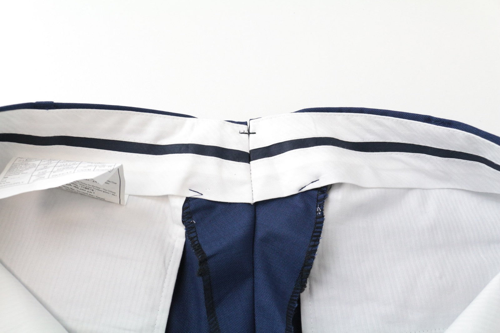 Used. Broken stitching on the blazer's collar. Altered trousers' waistline width. Pulled threads on the left leg and a tear around the back pocket. Please see added photos.