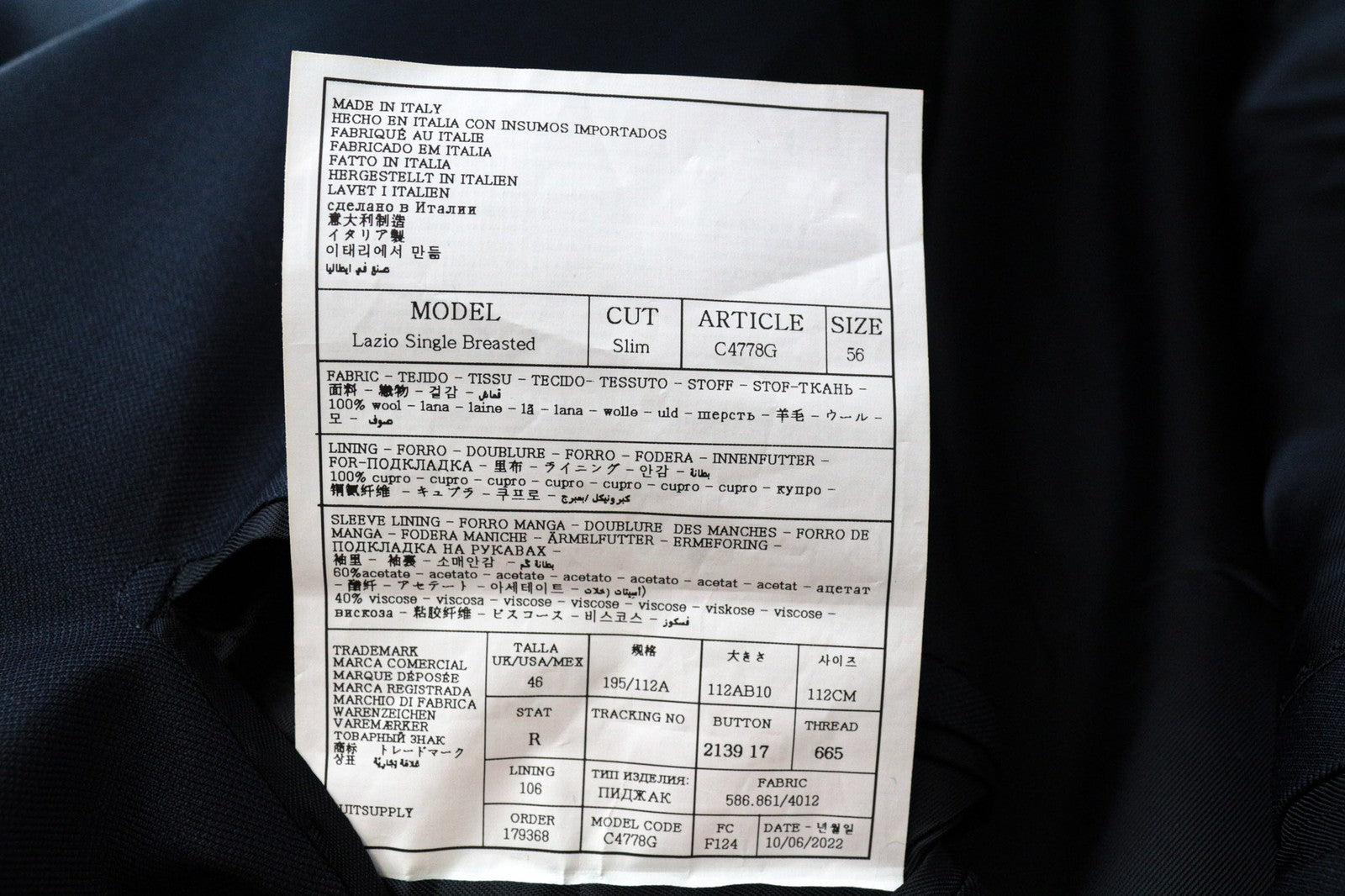 SUITSUPPLY Lazio Suit UK46R Men's Blue Slim Fit Wool 110's Lined 2 Piece