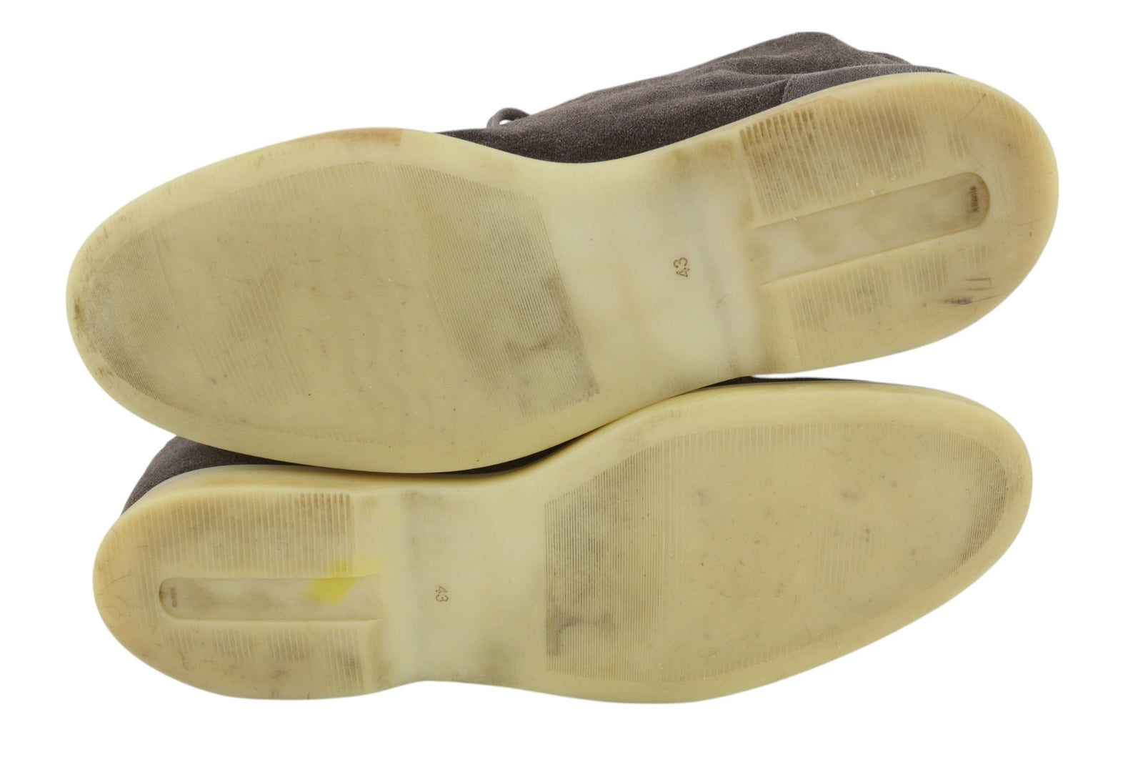 Used. Has stains and rubbed off marks. Unraveled seam on the right shoe. Please see added photos.