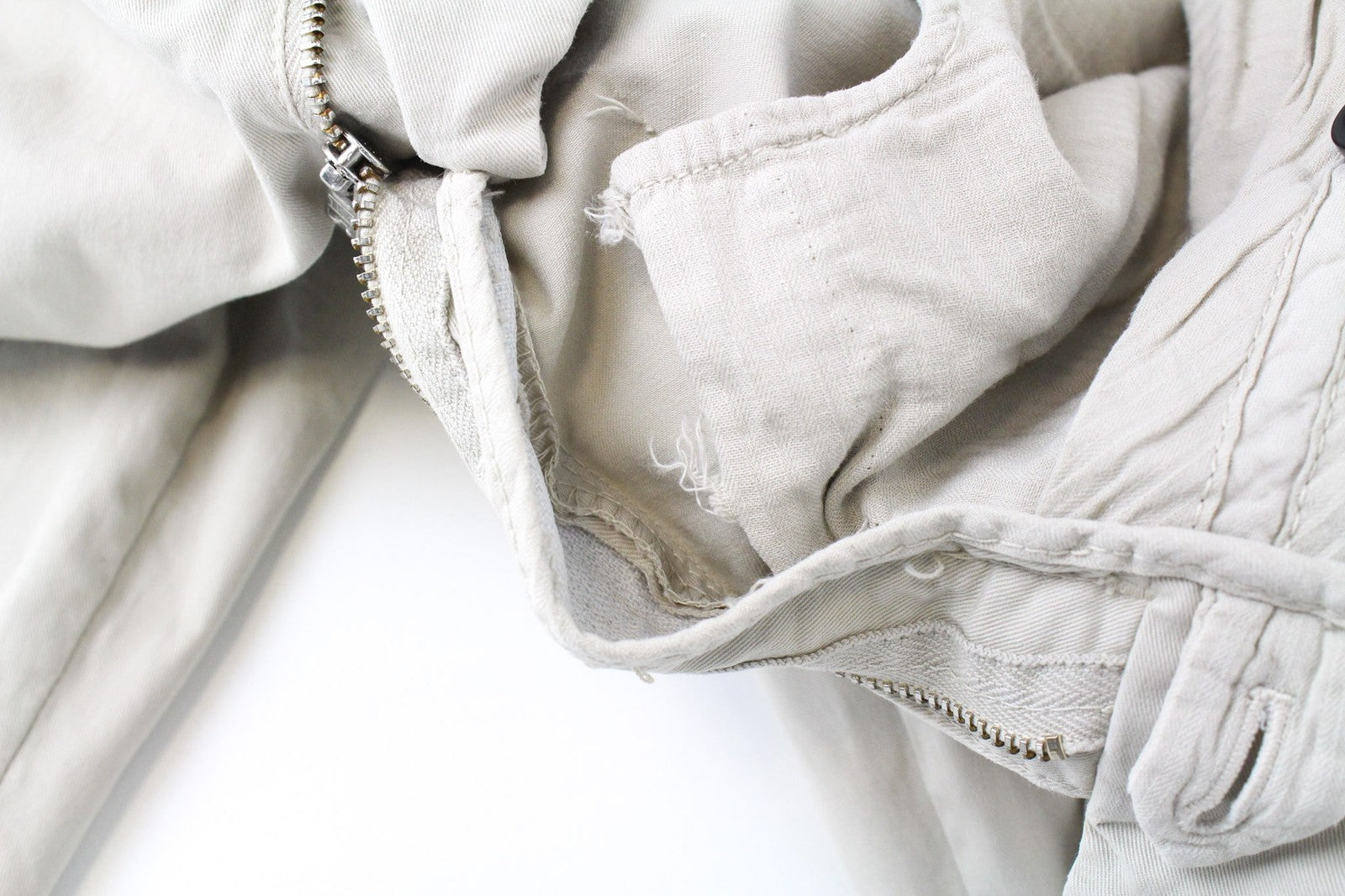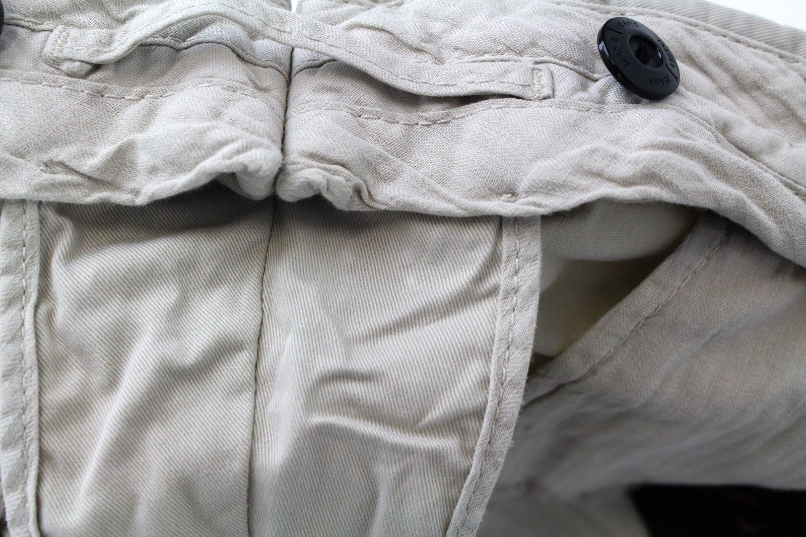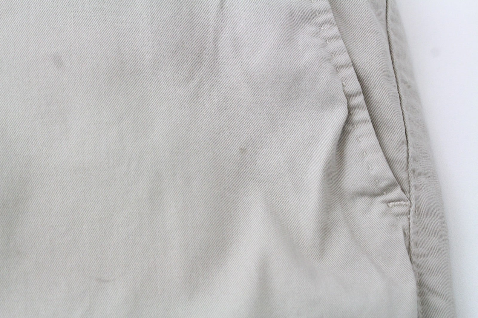 Used. No size and care tags. Altered trousers' length. Faded color spots on the trousers, both inside and outside. Many spots all over the trousers. Broken stitching of the pockets from the inside of trousers. Please see added photos.