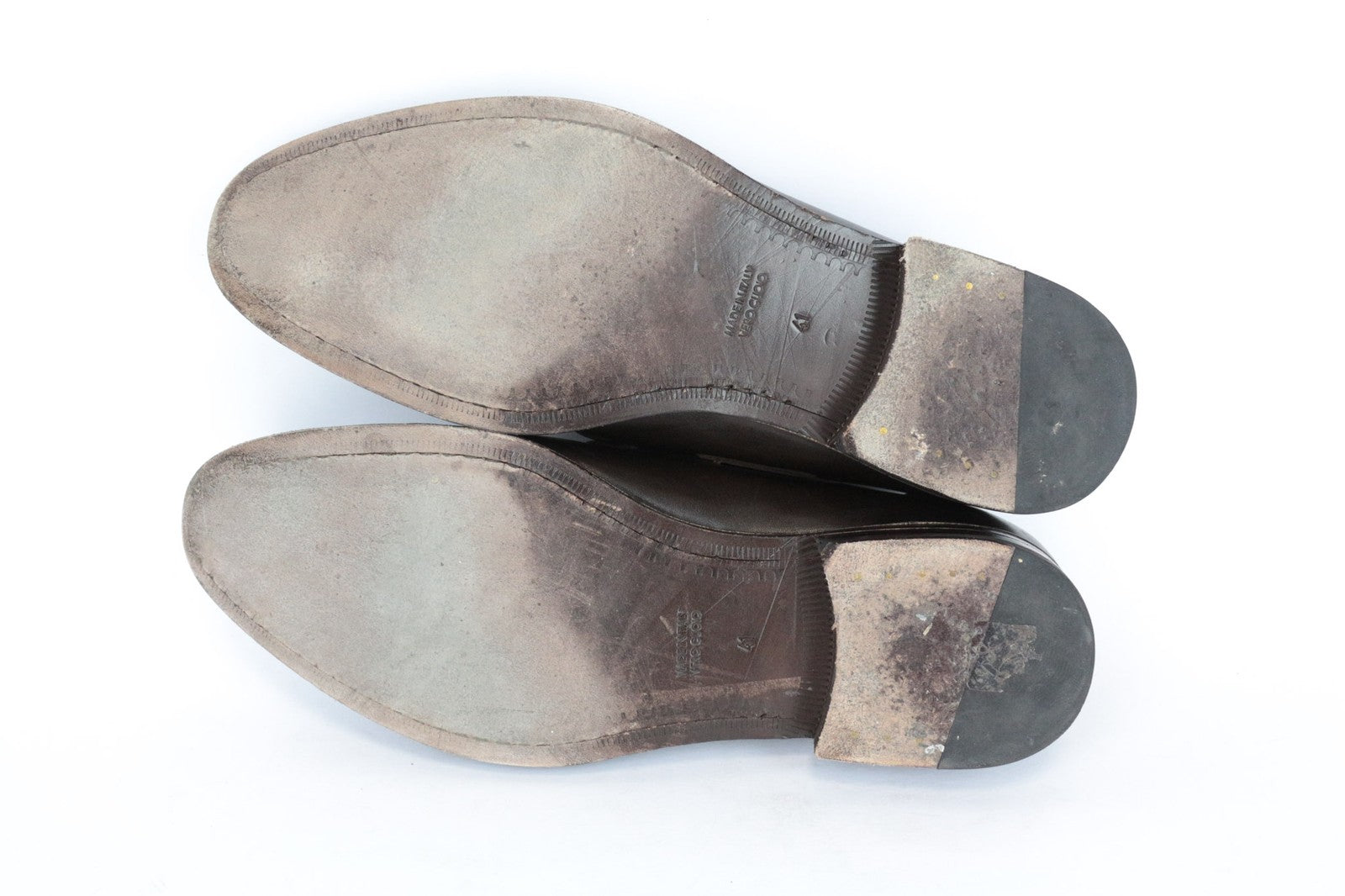 Būklė: Naudotas. Nutrinti padai, susiraukšlėję. Subraižytas dešinysis batas ir trūksta šoninės juostos. Žr. pridėtas nuotraukas.