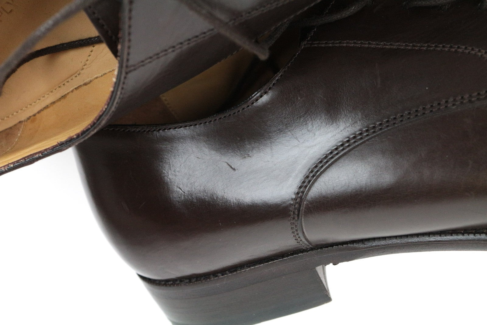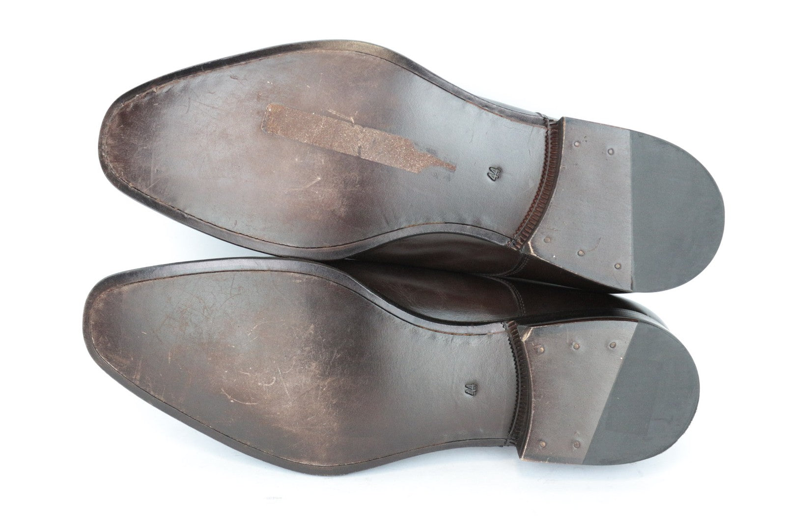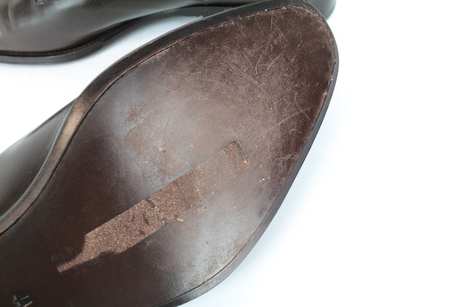 Used. Scratched outsoles and uppers of both shoes. Wrinkly toecaps. Please see added photos.