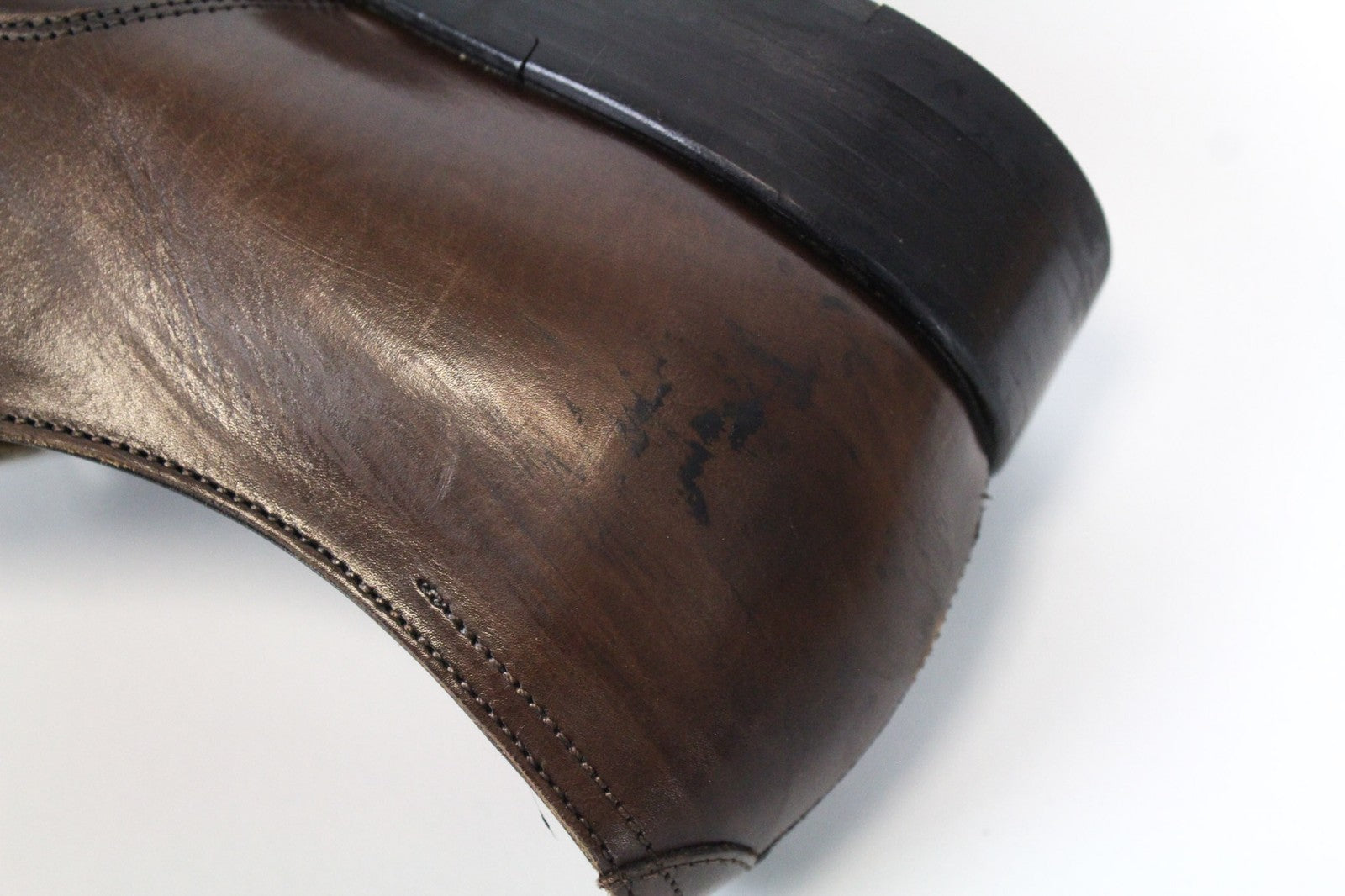 Used. Rubbed off soles. Has wrinkles, imprints, scratches and stains. Please see added photos.