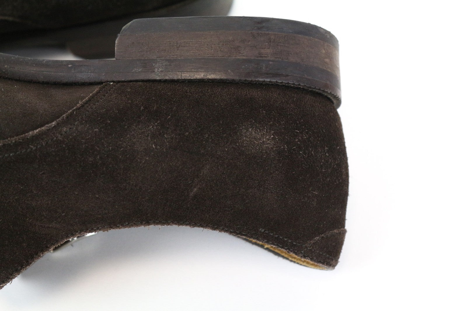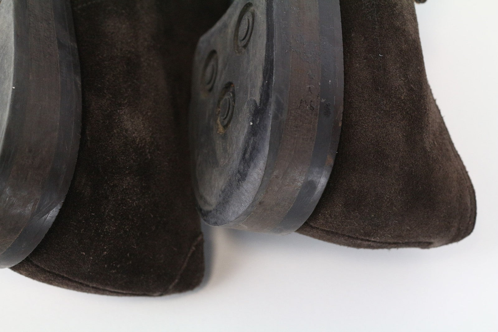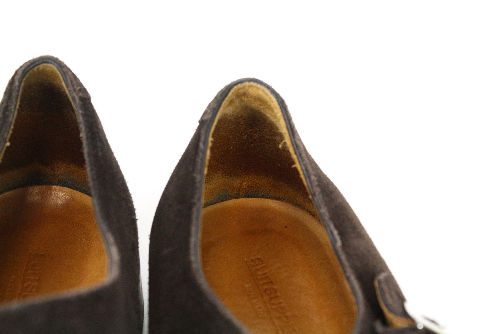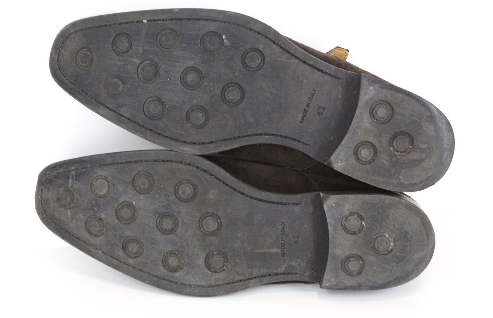 Used. Stained and worn out outsoles. Stained and wrinkly uppers, presure marks. Rubbed off suede. Please see added photos.