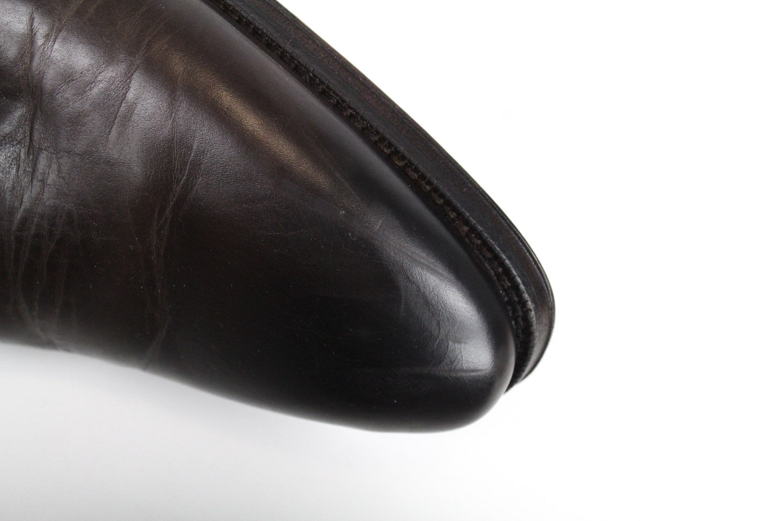 Used. Has imprints, scratches and wrinkles. Scratched soles. Please see added photos.