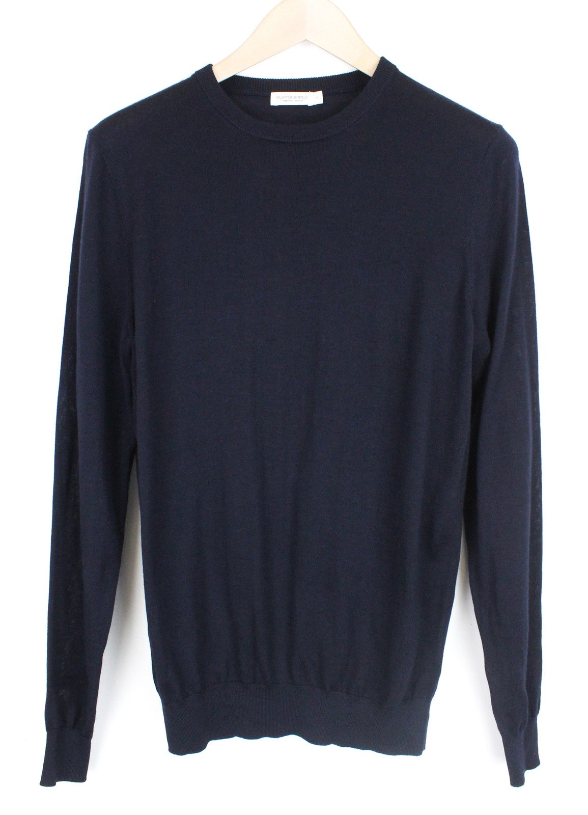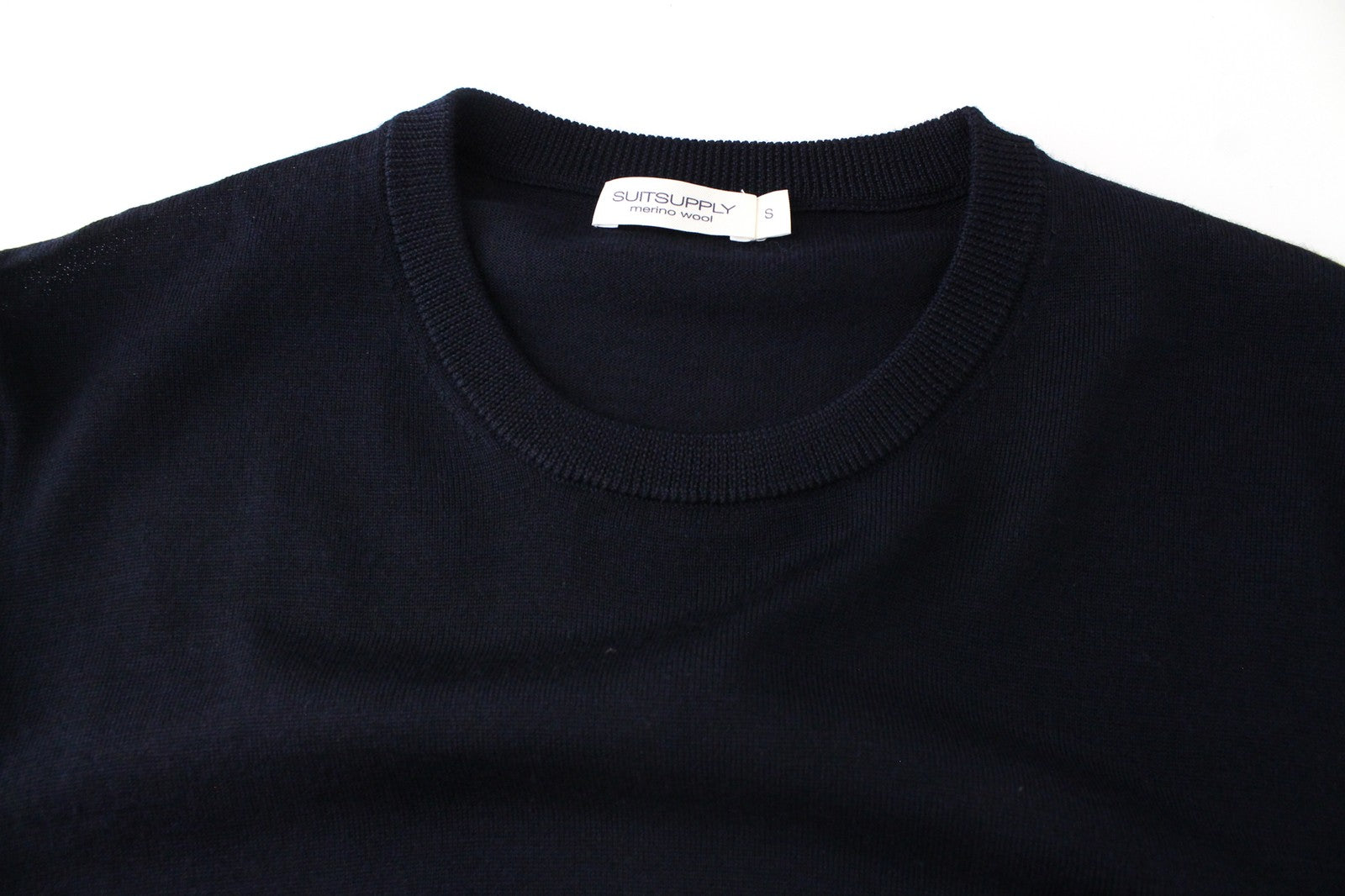 „SUITSUPPLY“ vyriškas megztinis S dydžio merino vilnos aptemptas megztinis, tamsiai mėlynas, megztinis su palaidine