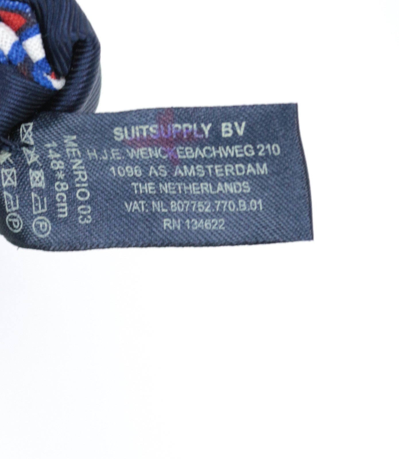 SUITSUPPLY vyriškas kaklaraištis mėlynas melanžas su grafiniais raštais, 148 x 8 cm, smailiais galais, formalus