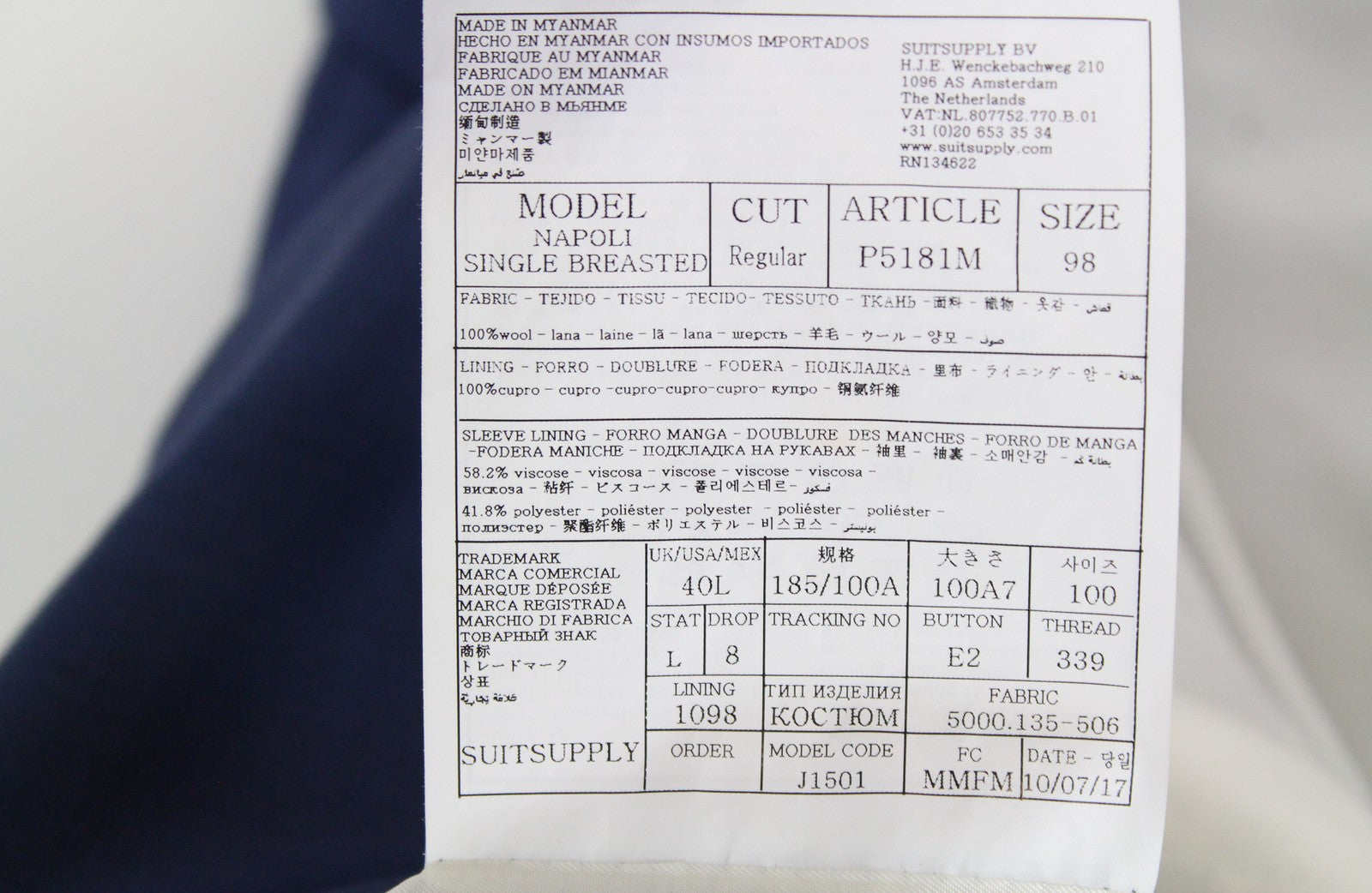 „SUITSUPPLY Napoli“ vyriškas švarkas, UK40L, mėlynas, „Super 110s“ su vilnoniu pamušalu.