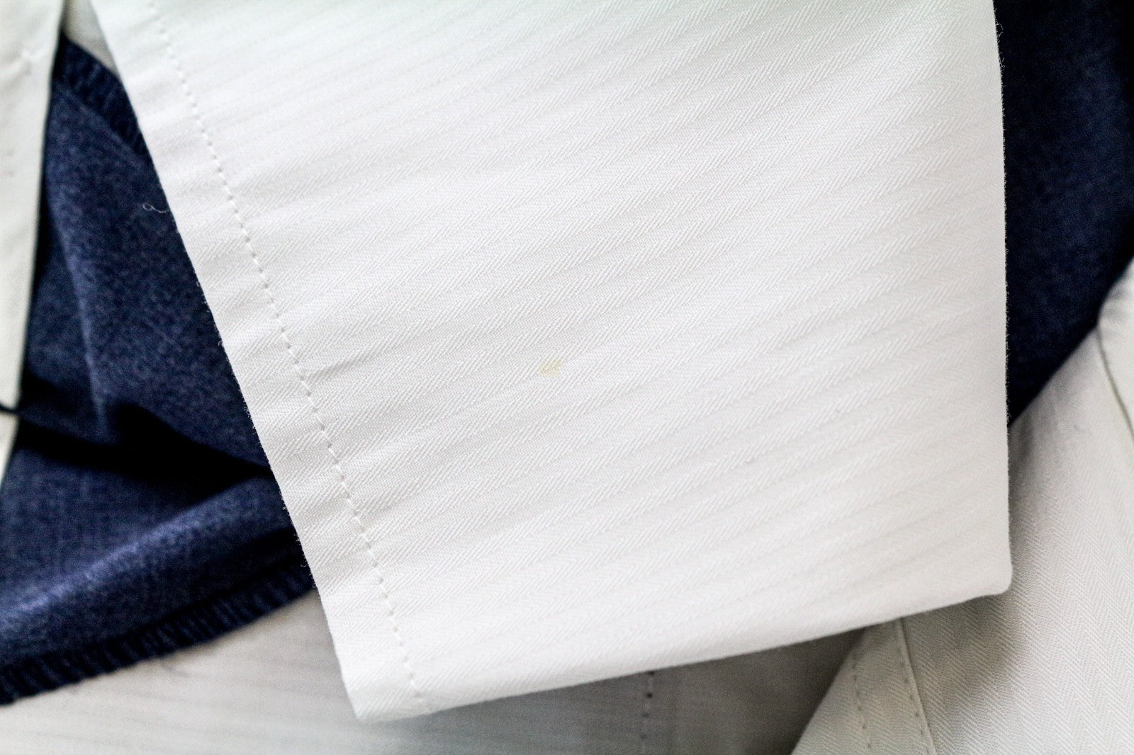 Used. Mended hems and waistline. Stain on the chest and inside back pocket's lining. Please see added photos.