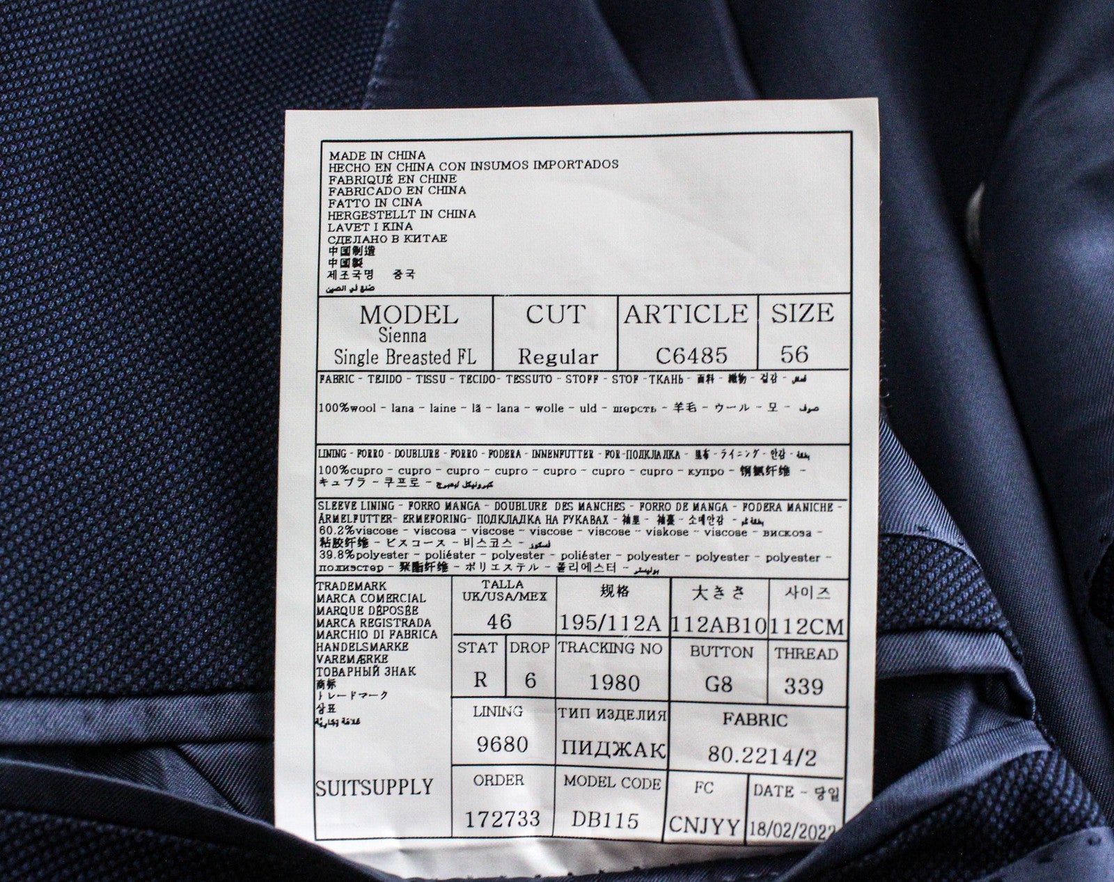 SUITSUPPLY Sienna Men's UK46R Blue Pure Wool Super 130's Lined 3 Piece Formal