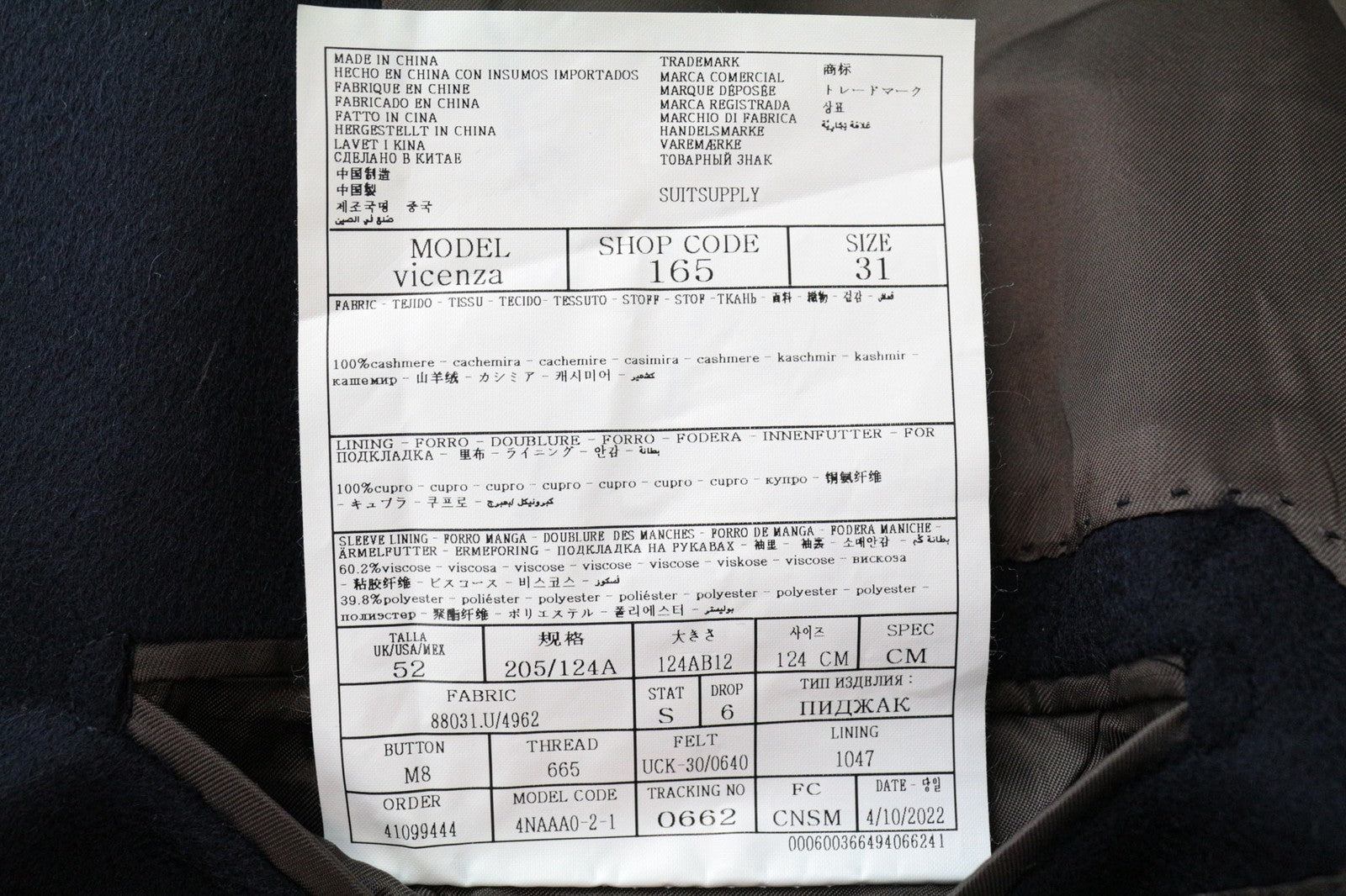 „SUITSUPPLY Vicenza“ vyriškas paltas, UK52S, tamsiai mėlynas, kašmyro, apvalus, vidutinio ilgio.