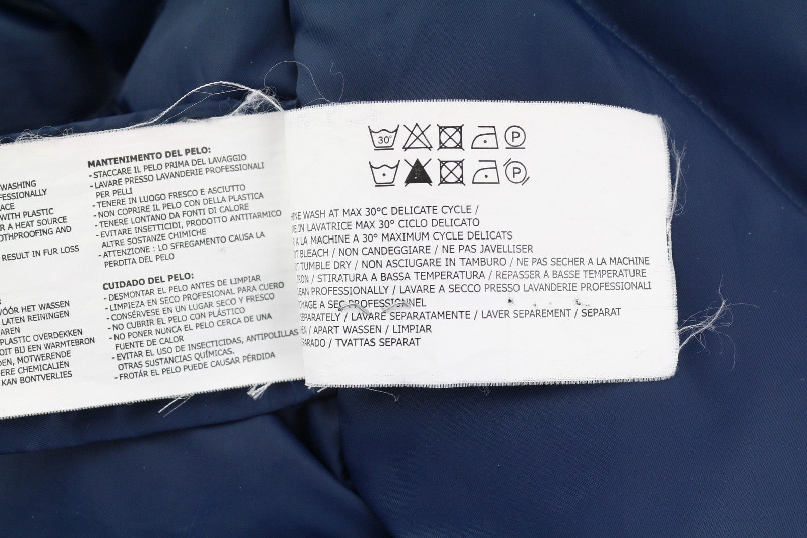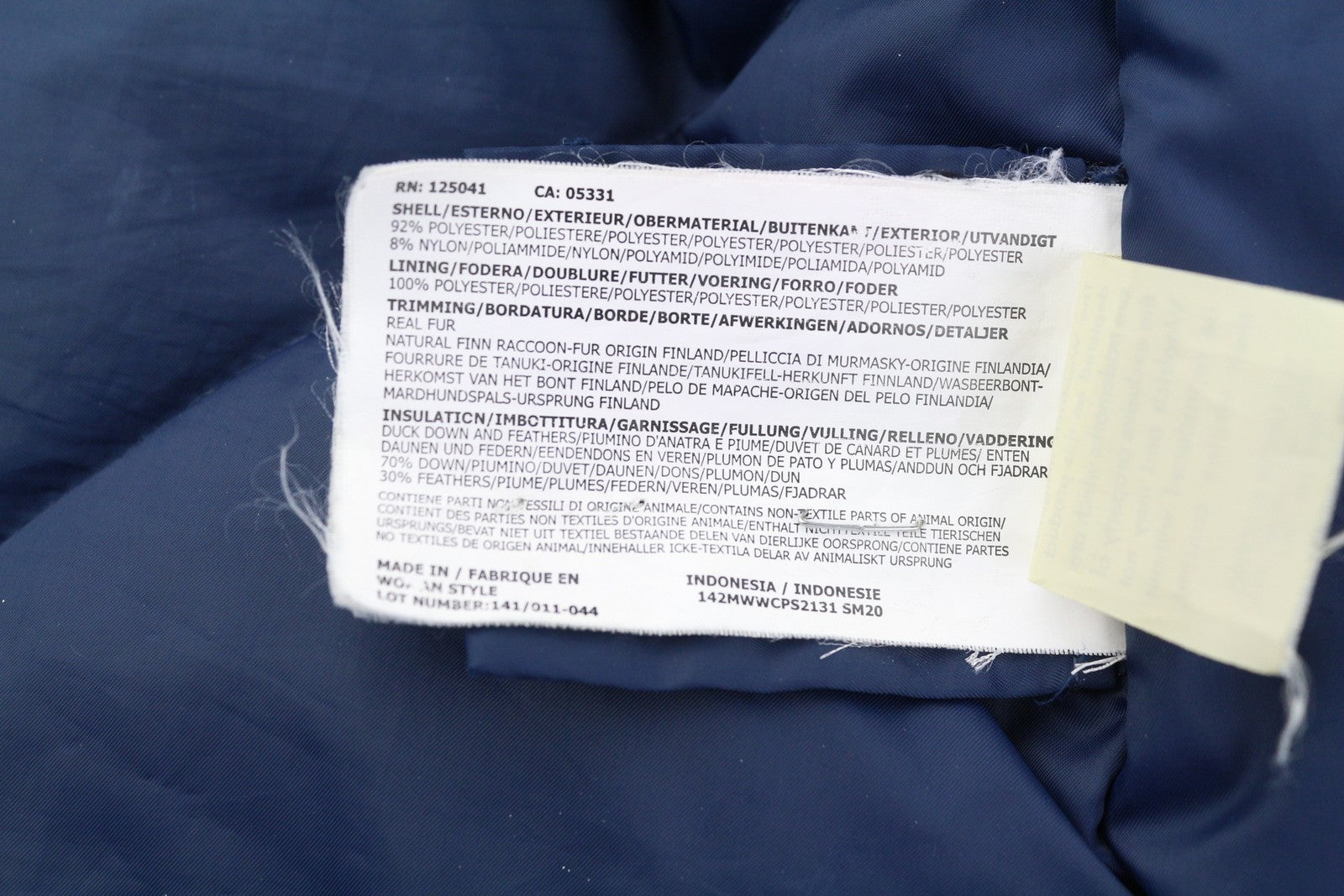 WOOLRICH moteriška striukė XS tamsiai mėlyna su ančių pūkų užpildu ir tikru kailiu, su gobtuvu, pilnu užtrauktuku